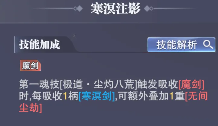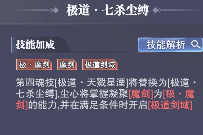 接着SP+尘心打长图还有一个非常关键的天赋树节点便是红色“剑影”分支中的,第四个节点下的第三个分支所对应的“极道·七杀束缚”效果,这个效果可以激活SP+尘心的领域,对于其长图的伤害非常之重要!
