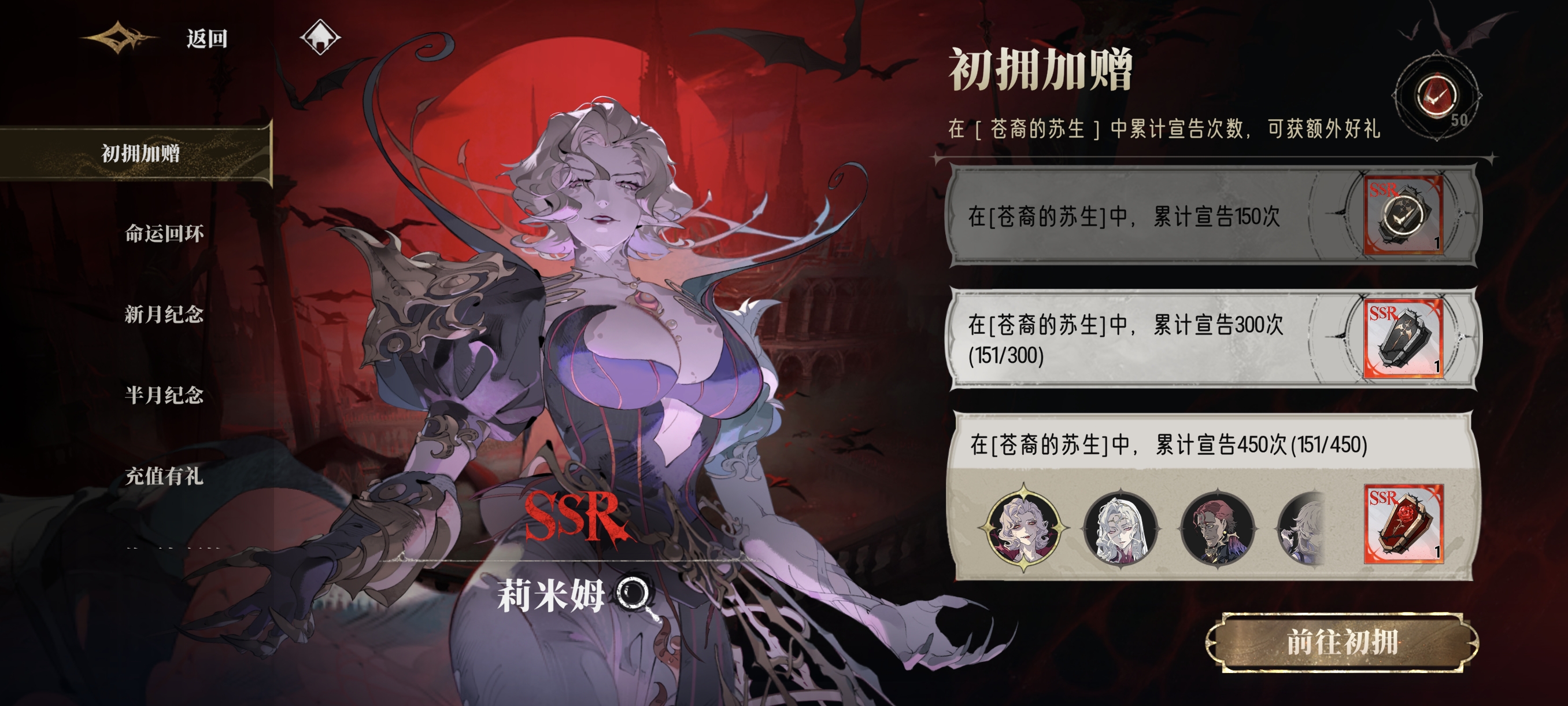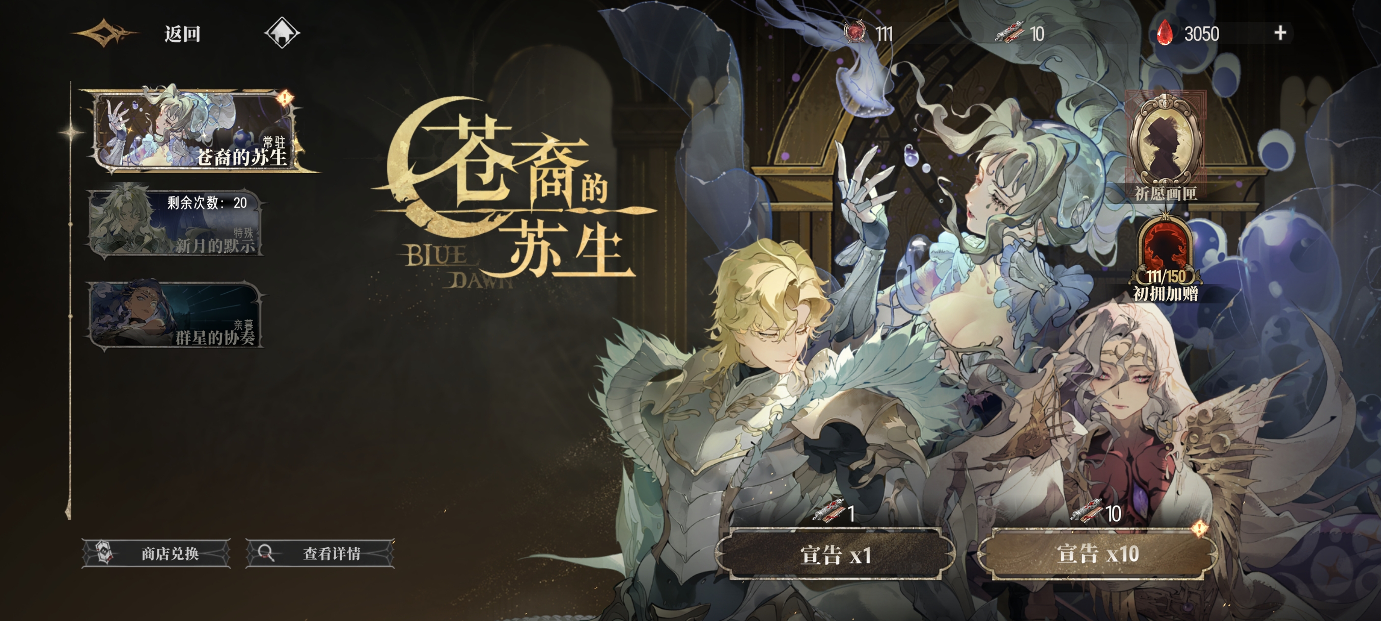 第二天上线,先把所有能领的签到奖励都领了,用月之啼补齐今天的第1-2次十连抽,毫不意外连个SSR都没抽到,不过不要急,马上可以拿到150抽的自选箱了。