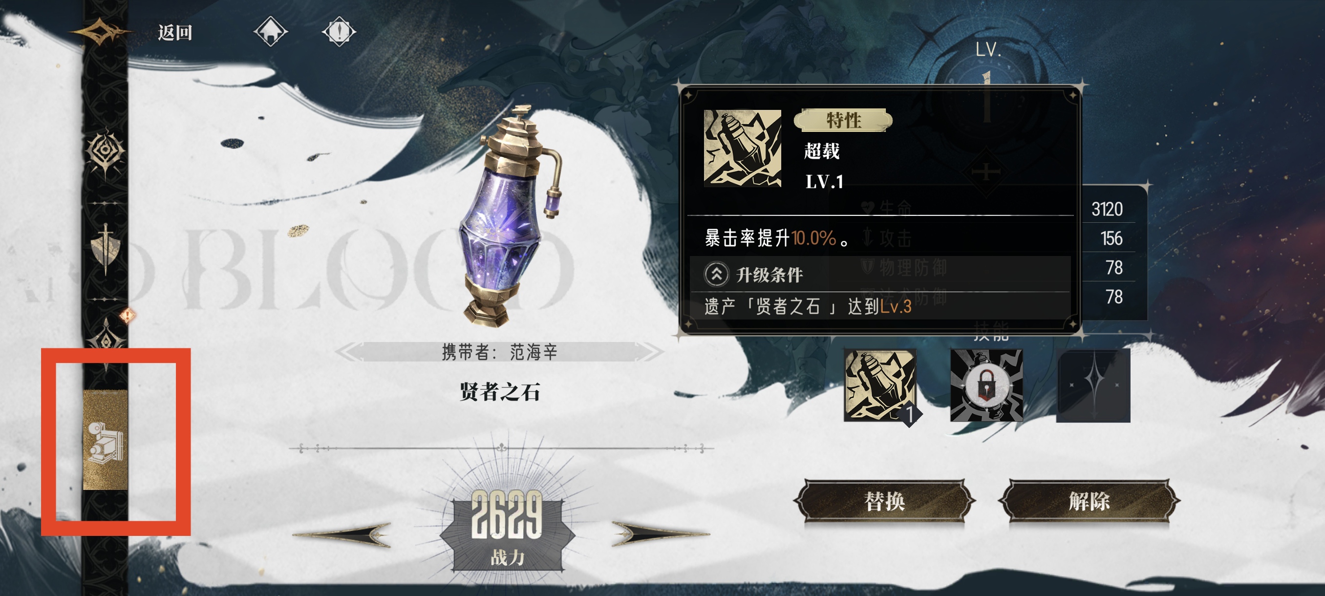 在人物界面左侧下方,可以为英雄装备未来遗产,我们获得的贤者之石能增加10%暴击,非常契合范海辛,直接装备上。