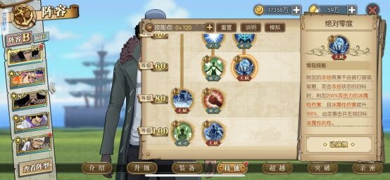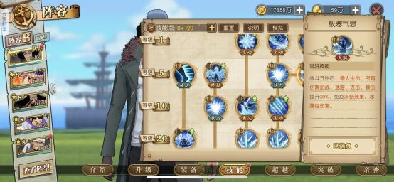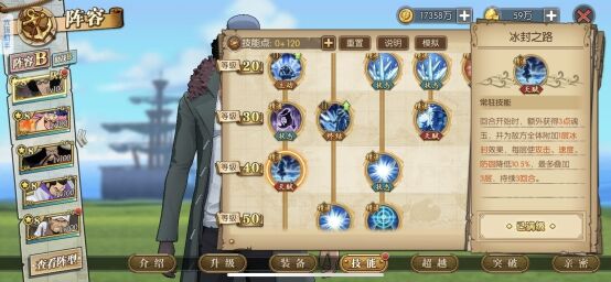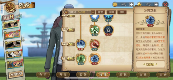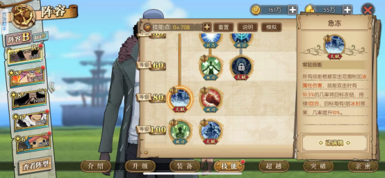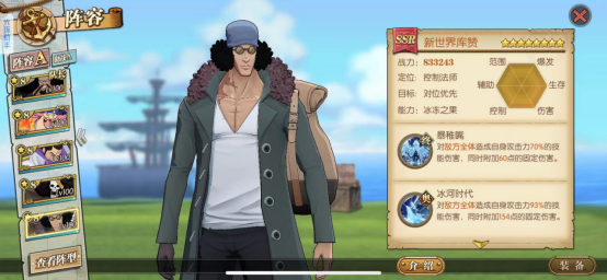 青雉核心输出技能,所有技能能造成冰属性伤害,技能攻击是有几率冻结,配合冰封层数效果,能有效提高冻结效果,这里的冻结基本除了大妈半血能解开,其他人物是不能解开的,(新世界赤犬除外)