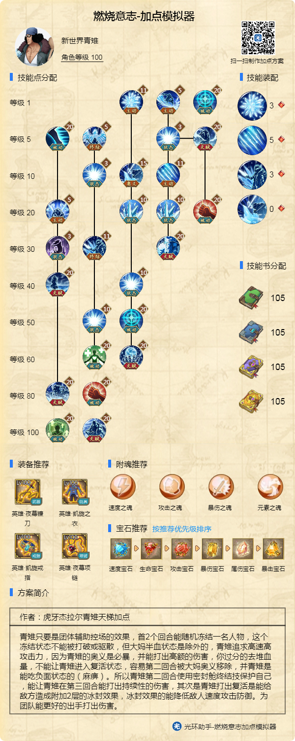 青雉8星天赋与6星天赋互相配合,使得青雉攻击冻结状态的人物能打出更高的属性伤害并必定暴击与无视冰抗的效果,把冰抗药都省了,不过青雉的冻结起到关键作用在首2个回合冻结的人物。