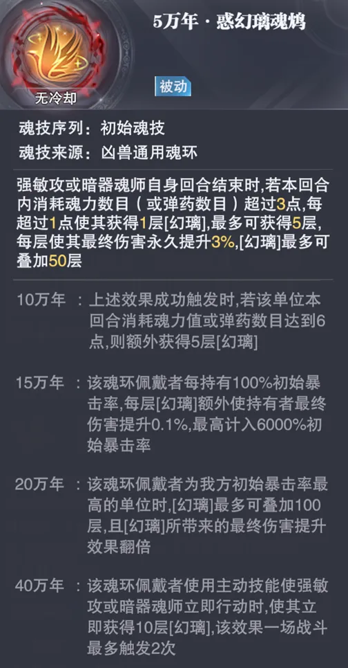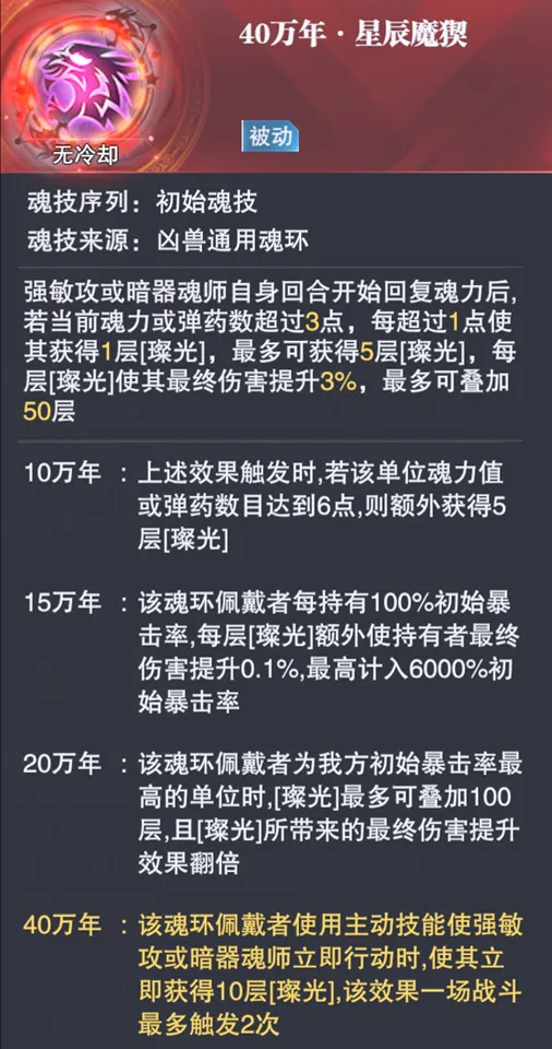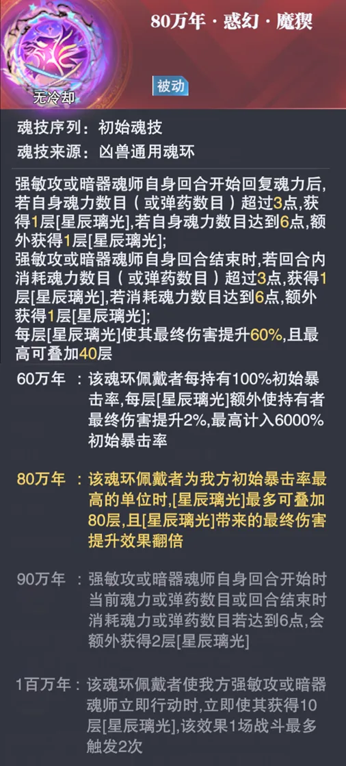 接着则是这两个凶兽魂环合成后的“惑幻魔猰”,这个魂环的设计官方是想在一定程度上缓和刚刚那两个凶兽的问题,因此是同时把消耗和积累两个逻辑都给设定到了其中,不管是满足了哪个条件都可以获得“星辰璃光”buff,同时针对每层“星辰璃光”的最终伤害提升也做了极高的提升......这个大家直接从其数值上的区别便能看到。
