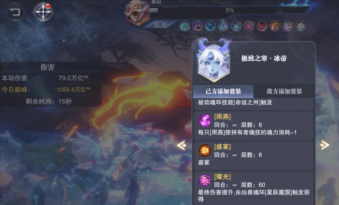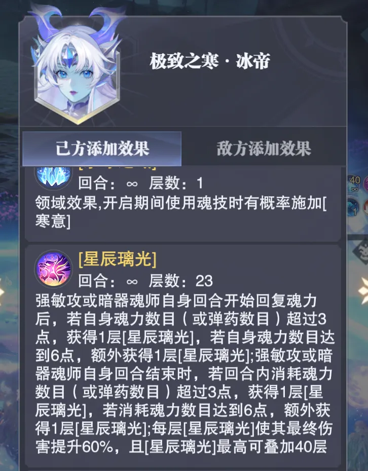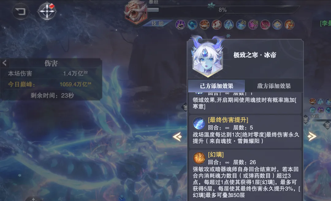 所以这个魂环在实战中的最大问题就是根本叠不满......例如我们全自动的一场5分钟的悬赏或长图战斗,然后“惑幻离魂鸩”给SP白沉香带上,在不手动控制的前提下,很有可能打完整场战斗SP冰帝的“幻璃”层数就在10-20层上下,而如果手动操作的话,在非SP小白上场的三控两辅阵容中,SP冰帝的“幻璃”层数可以提升到20多层(如上图所示),但距离上限100层依然有较大的差距......大家可以细品,诶......