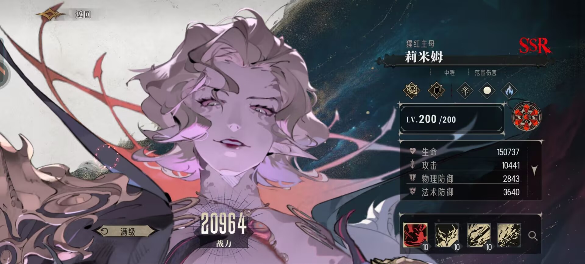 中程范围的高倍率法伤输出,技能命中后的敌人变为夜仆!莉米姆对夜仆有额外的伤害加成和吸血能力。
