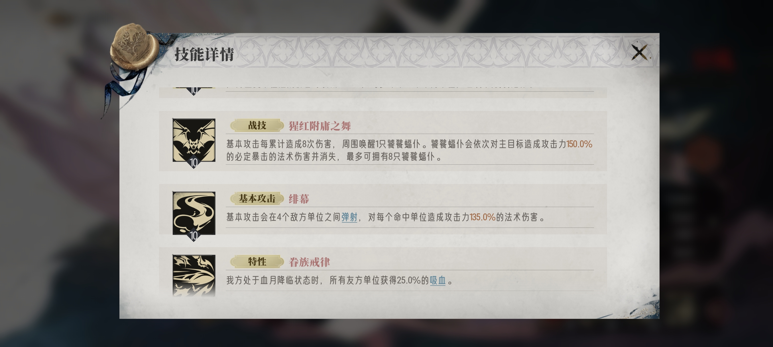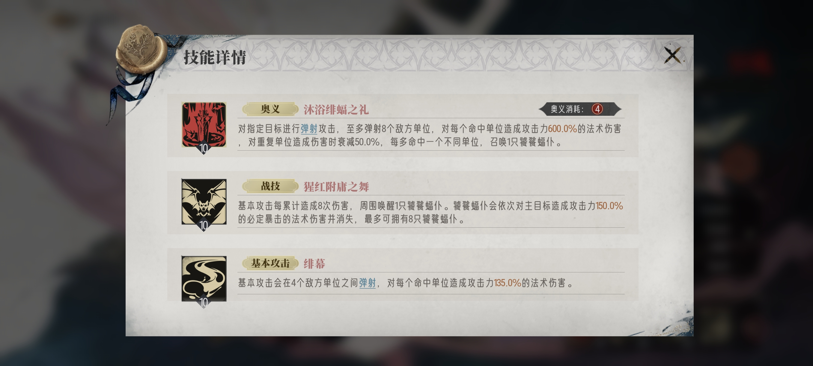 造成最多8次弹射伤害,根据被命中的不同敌人数量召唤出战技同款的自爆蝙蝠攻击。