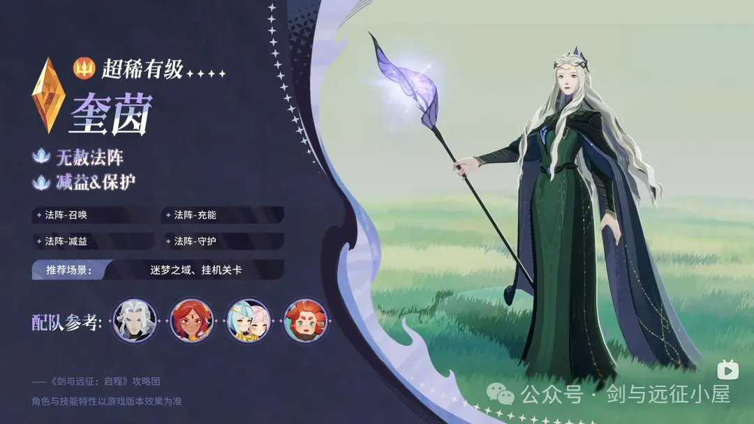 召唤4个法阵,点亮后提供全队回血、护盾、降低敌人急速(最高减70点)及双抗(最高减60%),后期点亮全法阵后可将效果扩散至全场,并偷取敌人30%基础属性加成友军。