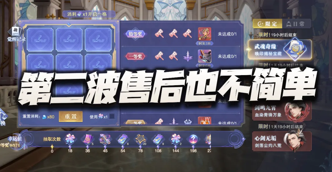 今天属于SP+尘心的第二波售后也是正式降临......当然采用武魂奇缘这个活动形式嘛,估摸着也让很多朋友背后冷汗直冒,因为这个活动一般而言少则500多次,多则700多次的特等奖保底次数也真是够绝的,那么到底这次活动的性价比如何,接着咱们就来简单说说。