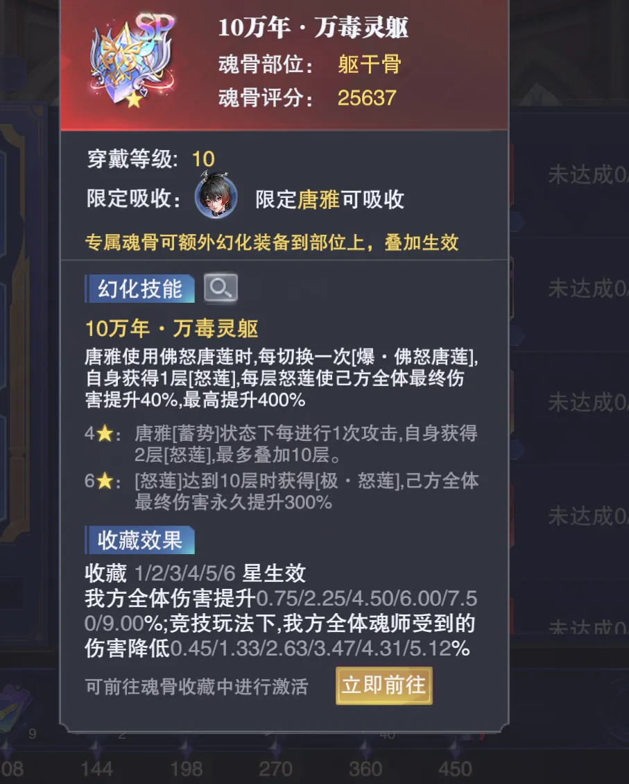 首先是累抽270次可以获取的暗器唐雅躯干骨,这块骨头需要大家有佛怒唐莲才能有更高的增伤效果,当然因为佛怒唐莲这个暗器倒是要比不久前才上线的新暗器“焚天玄扉”老多了,所以大家理论上的保有率也会更高不少,相对而言这块躯干骨所带来的怎增伤效益可能就要比之前暗器唐雅的头骨稍微好一些,大家参考下即可。