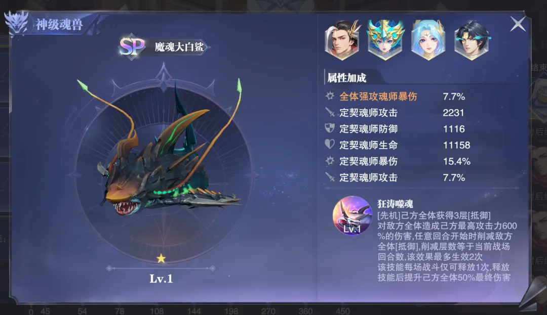 然后则是一等奖,91抽后的一轮可以获取的SP级别神兽“魔魂大白鲨”,诶......这这这果然SP级别的神兽还是跑不脱啊,而这个神兽则可以削减对方的“抵御”层数,相对PVP还是有一定的价值,此外长图中也可以为我方进行增伤,但幅度并不算高。