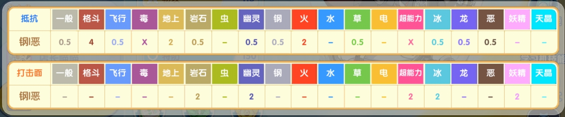属性分析:弱点不算多,但是都是当前版本热门的属性,并且4倍弱格斗系。格斗系的武道熊师以及火系的苍莲鬼骑都是版本热门宝可梦,所以整体环境还是比较差的。