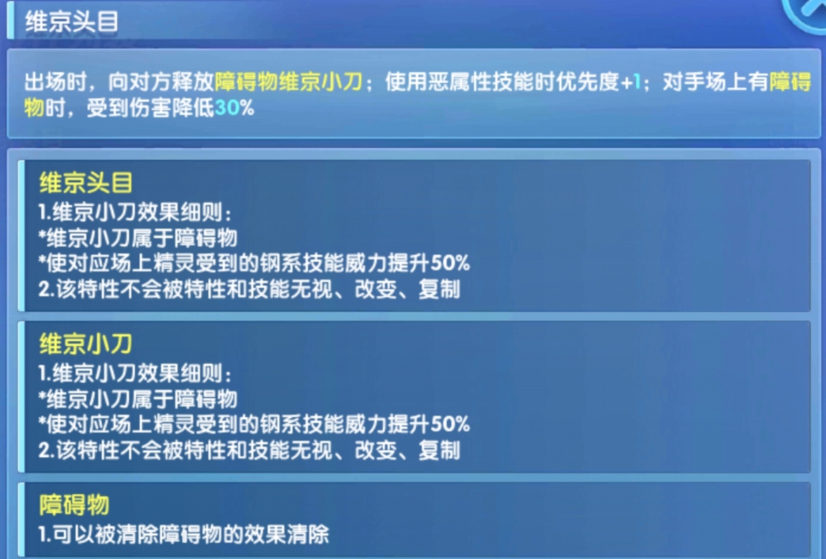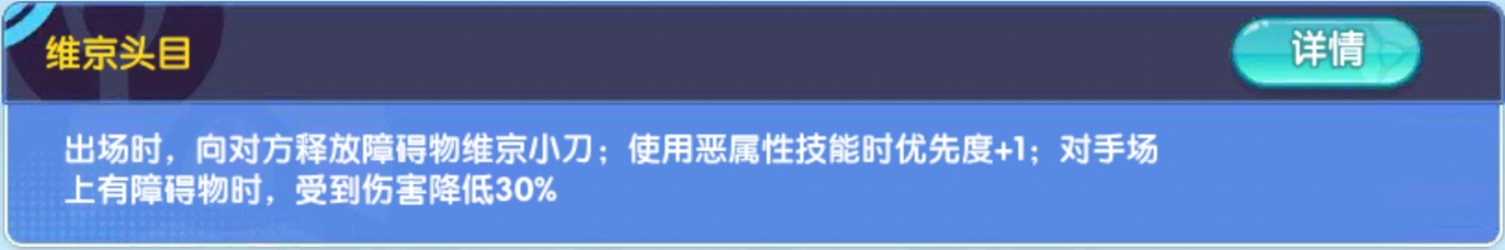 ·出场时,向对方释放障碍物维京小刀;使用恶属性技能时优先度+1;对手场上有障碍物时,受到伤害降低30%