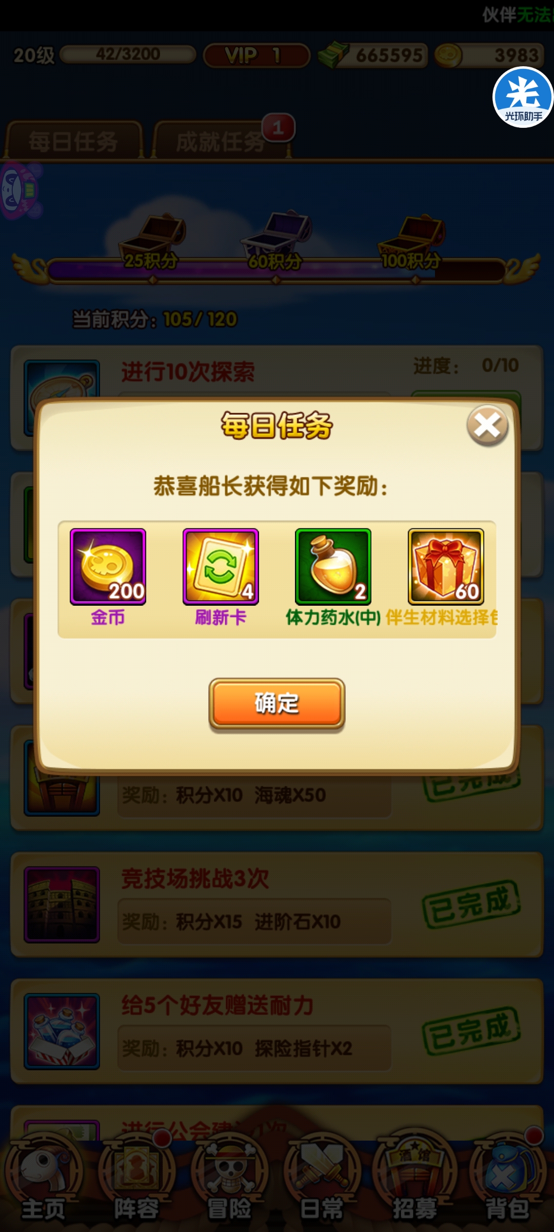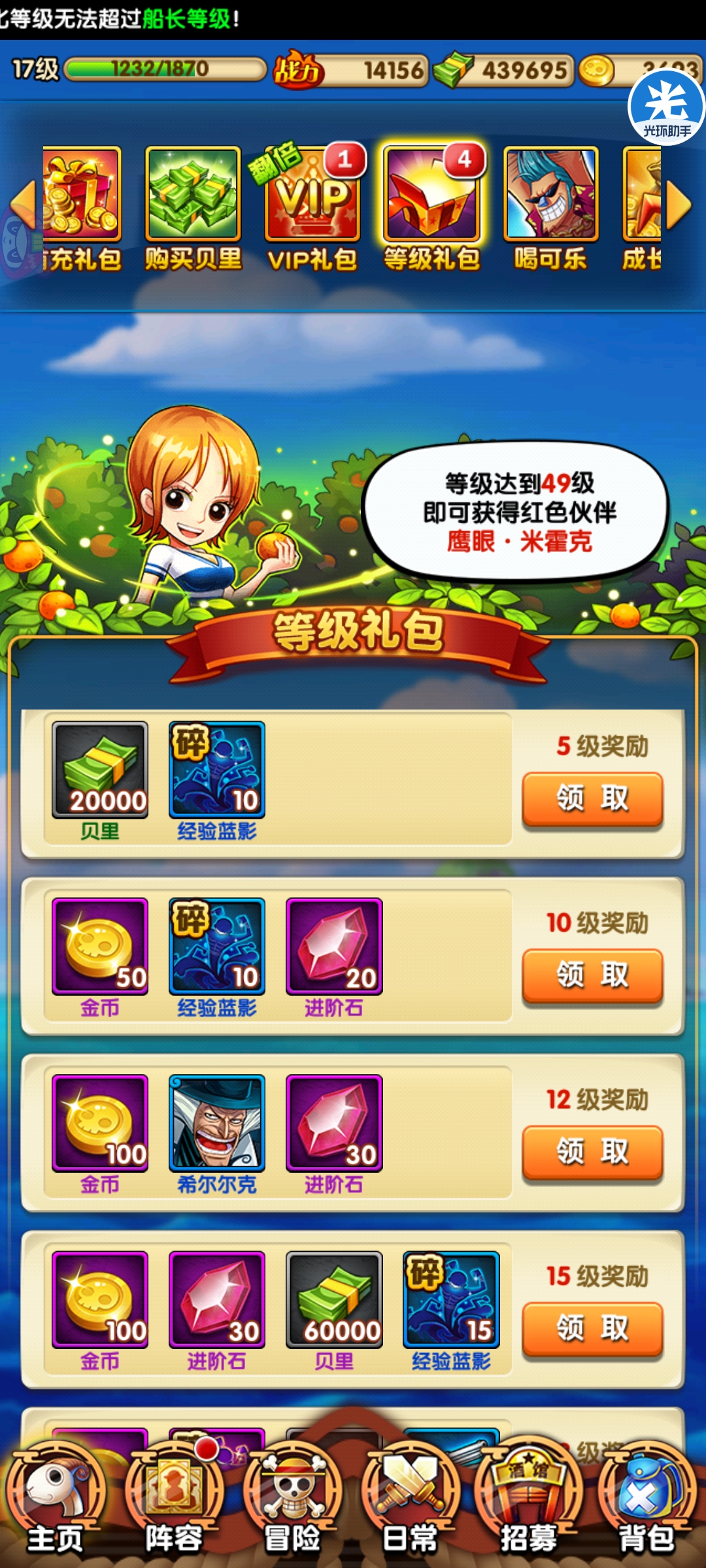第二天 因为我是白嫖党,然后也不打算花金币买强者精华,所以日常副本和推进城几乎没有推进 然后依旧分享一些小技巧 1.图2里面的鹰眼签到会送vip经验,那个等到量可以到下一个vip等级再领,因为船团活动再领有额外加分 2.图3里面的背包里伴生石资源包,就是每天完成任务送的那个最好不要用,因为海洋活动再开有加分 3.悬赏券不到必要也不要用,后面有个花悬赏券可以增加资源来源的活动 4.图5是推图奖励,这些给衣服和金币的就可以放心大胆领了,这些存到后面也没用 5.图6是升级奖励,还是一样,有包含进阶石的就不领,不包含的就领 [图片评论]