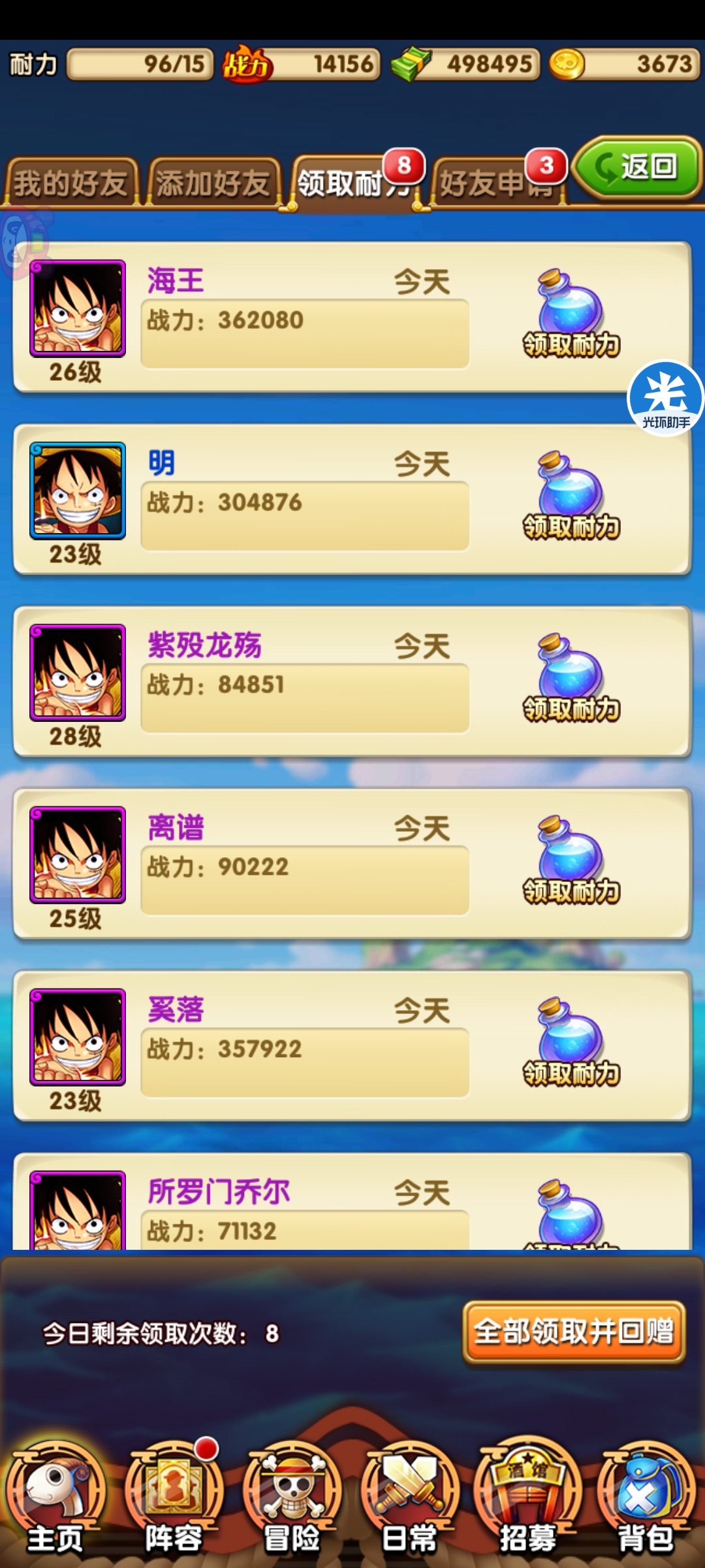 第七天了 1. 送的红卡免费包开的是和索,因为我打算后期用金凯多,金凯多和和索的养成路线非常接近,基本可以无痛转,也不用考虑物攻魔攻的问题,所以前期先用和索过渡后期再转金凯多 2. 开了红卡包后一路平推到那个雪城(名字我忘记叫什么了,只记得好像每天都会下雪),如果零氪白嫖党一直推不过去可以尝试一下换阵,先上四个人,然后慢慢调,实在不行上五个,一般第7天是能推到那座雪城的,这里还是推荐在伙伴商店刷一个+5山治出来,非常好用,怒攻无敌,然后放前排一直抗伤,嘎嘎猛 3. 把从开局攒到现在的耐力一共700耐力一次性梭哈,出了4万宝物结晶和2个翎羽耳坠 4. 探索出来的活动像三个宝箱那种,如果开出来一个50金币是可以考虑接着再开一个的,偶尔运气好会出三个金币宝箱。探索是经常会出好东西的,像伙伴碎片副本(打败相应的伙伴就可以出伙伴碎片),出了伙伴碎片以后可以融掉去伙伴商店里面换橙色饰品或者其他的好东西。还有进阶石副本,打败那个戴眼镜的海盗会送十几个进阶石,前期进阶石还是很缺的。或者是答题,对了会有50金币,和海王,击杀海王会出宝物,宝物可以融掉换其他宝物或者是万能宝物,相当赚。但是那个打副本掉突破石,的和拿金币换伙伴,拿金币买东西就直接忽略就可以了,那些用金币买太亏了 5.饰品碎片里面偶尔会有经验银钻和经验金钻,那个不要合成,后期可以嫖船团对决的分数 6.那个鹰眼签到可以攒到第7天再领,因为领到第7天的vip等级会升到vip2,然后后面一直攒着到需要用再用,vip经验可以白嫖船团对决的分数,而且除非到v4,v3跟v2几乎没有差别,但是最好是vip先领到v2,v2每周会有一个体力包,而且还会开红卡和亿万卡的招募,特别是亿万卡,亿万卡的来源途径非常少,然后等每两天的免费一抽就可以了 7.前面七天的开服活动尽量做满,因为过了前面七天就没了,但是如果要用金币的话就算了,金币属于通用资源,比金币还珍贵的资源只有后面的高级道具 [图片评论]