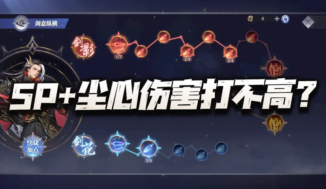 那么第一个首当其冲的因素便是SP+尘心的星级,而他的星级影响最大的便是SP+尘心天赋树的加点数量,其星级越高则我们可以在天赋树中点出的技能点也越多,当然这个加点的逻辑等下我们还会细说。按照官方的设计逻辑,SP+尘心未来的如魂骨等售后应该会大幅度的影响他天赋树的分支与加点数量,例如这一块专属魂骨和进化魂骨便已经充分说明了,没魂骨连打短图和快速PVP的先机效果都没有,而只有拿到这块魂骨才能激活打短图和快速PVP的能力,同时有没有魂骨还会大幅影响天赋树的加点数量,例如基础魂骨额外给2点,进化魂骨额外给3点天赋树加点也会大幅影响SP+尘心的强度上限,此外根据这两次魂骨上线时的操作,未来当有新的售后措施加入时SP+尘心还会新增天赋树的分支,这或许也是官方不断加强SP+尘心的一个重要思路。这点其实很多朋友都还处于个有点懵的状态......其实SP+尘心天赋树的加点和他的伤害会有巨大的关联,这里我们用长图SP+尘心的三种加点方式和三种方式所对应的伤害来做个举例大家就懂了。PS:案例中的SP+尘心星级为彩色2星,有专属魂骨但没有进化魂骨,此时的总加点数为16点,接着案例中所打的战斗场景为神墟悬赏的敏攻系多桩boss,天气为烈日,所采用的阵容为标准的长图三控两辅(两辅中有一个是对应生命位的暗器唐雅),测试号等级为99级,战力约1300亿,此外由于游戏的数值早已崩溃,以下案例的对比结果仅供大家参考。第一种加点方式是直接把第一排红色“剑影”给拉满,而下边的蓝色“剑花”和黄色“剑舞”则根本不理,那么这种加点方式的特点在于:- 不但激活了领域,且还激活了领域生成后的补“极”魔剑能力与对应补“极”魔剑后的增伤能力