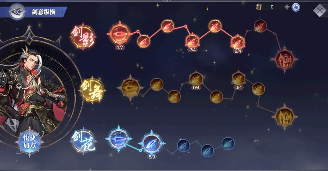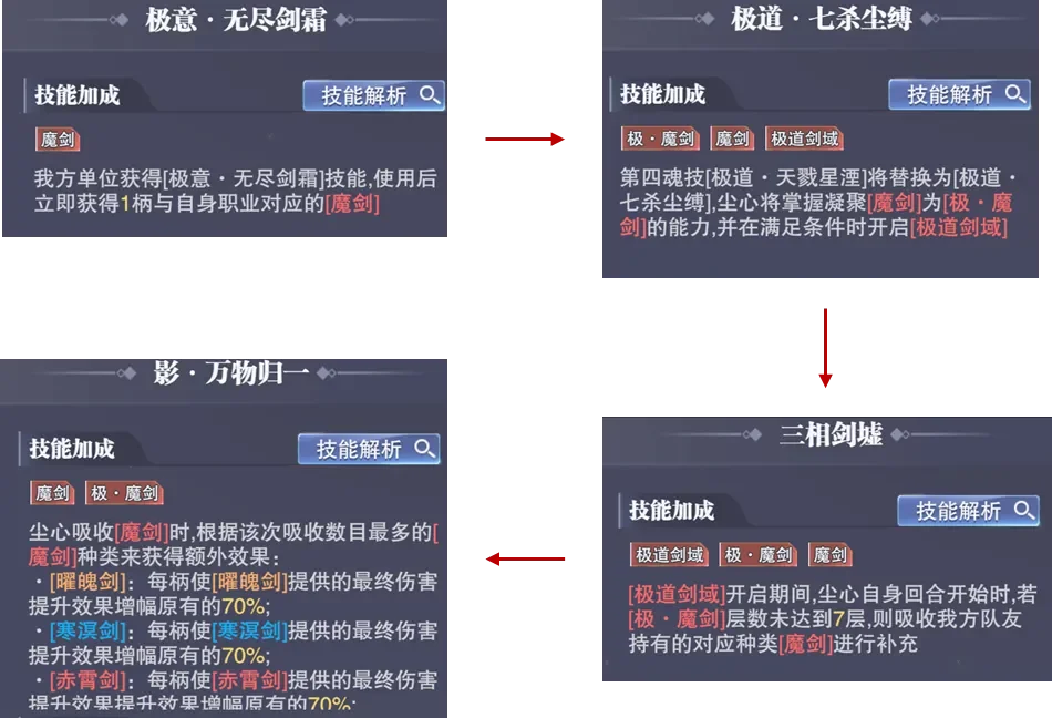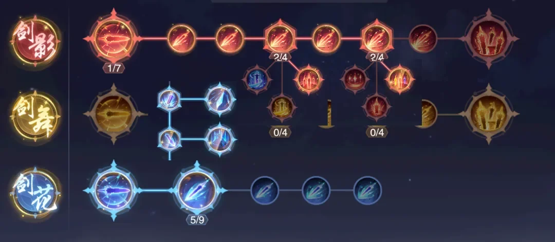 而这个点法最终的平均伤害约为10亿²⁶左右,比刚刚第一种点法的伤害基本上提升了100万倍左右。最后第三种加点方式是直接把第一排红色“剑影”给点到倒数第三个节点即可,而下边的蓝色“剑花”则按照上图所示,黄色剑舞则依然不理,那么这种加点方式的特点在于:- 激活了领域,同时激活了领域生成后的补“极”魔剑能力,但并没有激活补“极”魔剑后的增伤能力