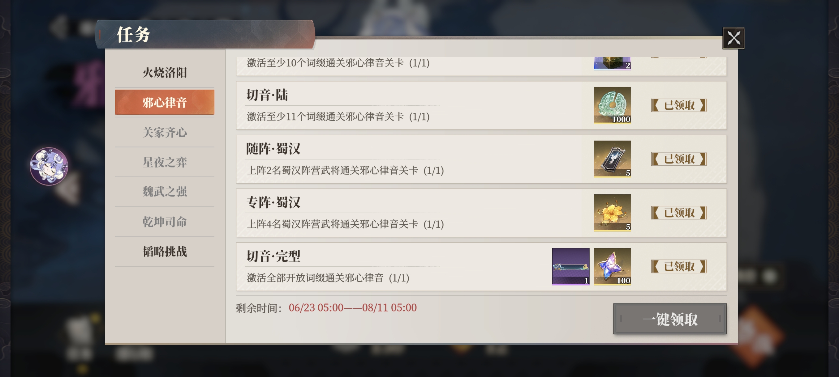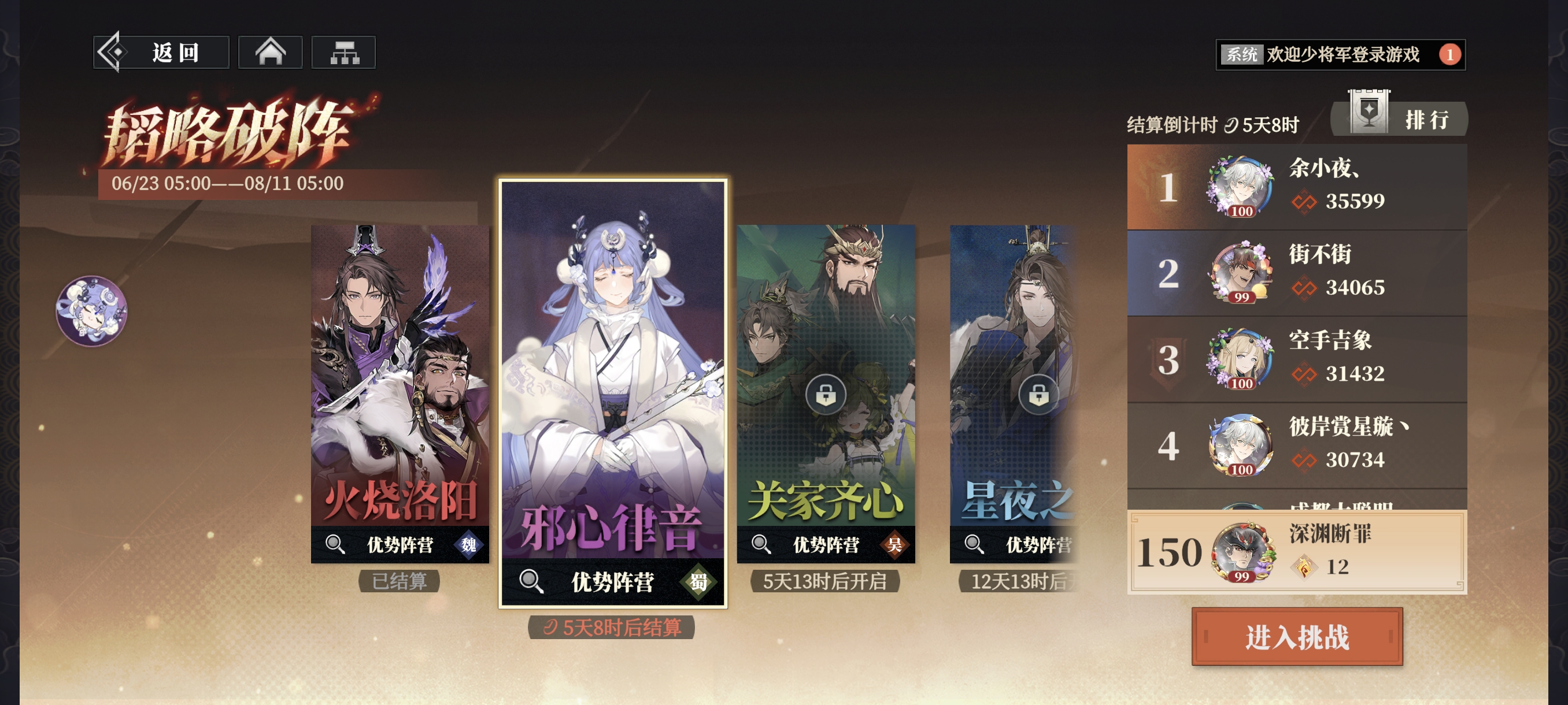 韬略破阵是每周一个主题,每个主题BOSS满星通关都能获得:1500三山壁+10普抽+10风物抽+200命石+100枭锤锤等奖励,奖励还是比较丰厚的,而且配置要求不高,第二期比第一期难度略低,低配满星将更加容易。