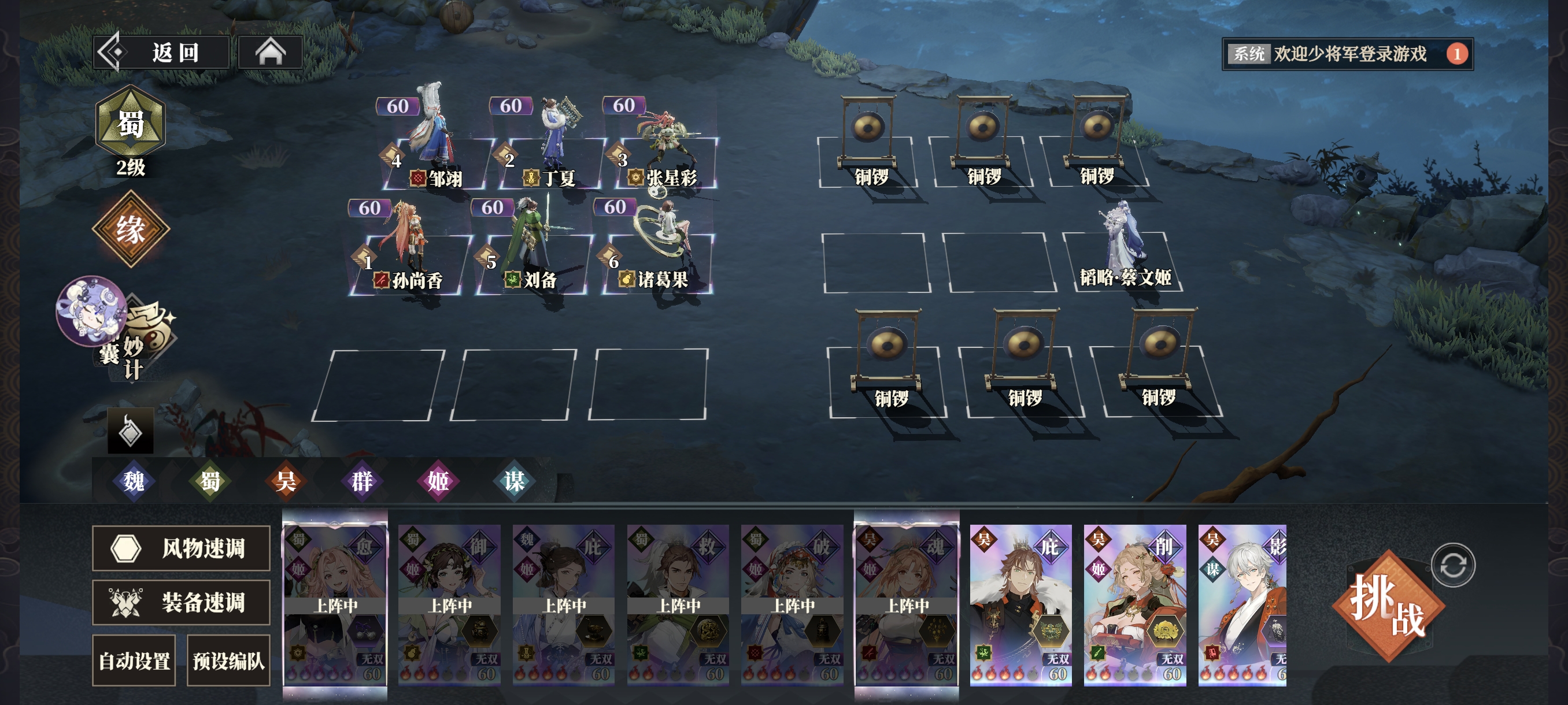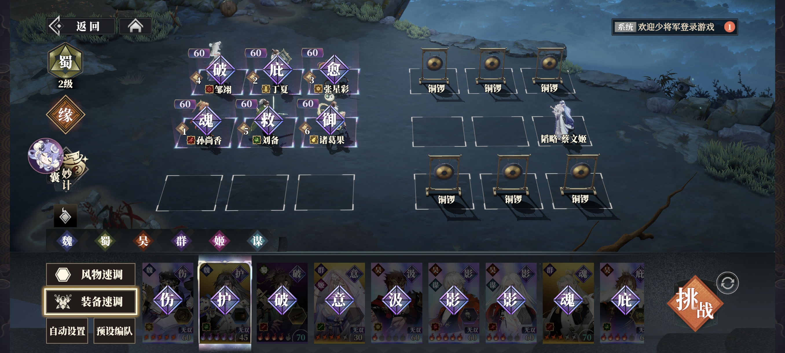 蓝紫卡邹翊、星彩、丁夏啥练度都行,刘备诸葛果有1火最好,3星也能用,主要就是拿来凑4蜀,诸葛果全程木桩不用动也不需要坦度,刘备偶尔奶一口,基本都用普攻邀战。唯一需要练度的就是我们的主C孙尚香,至少要3火,5火最好,携带高星风物-无间鹿鸣。
