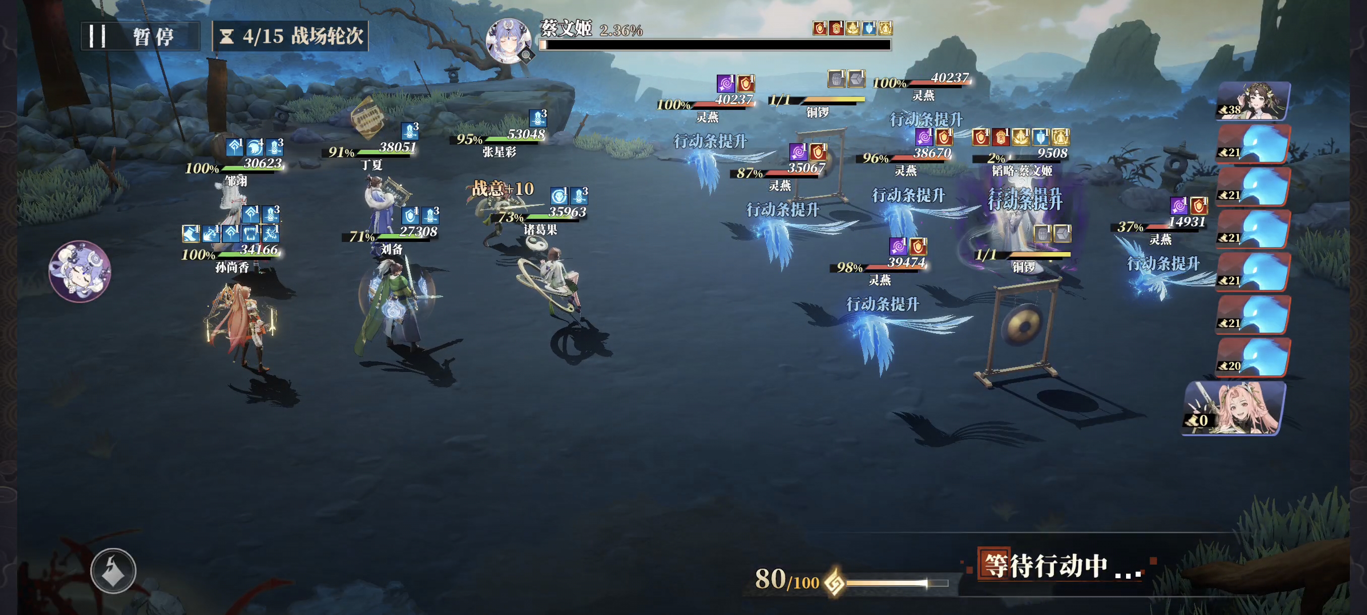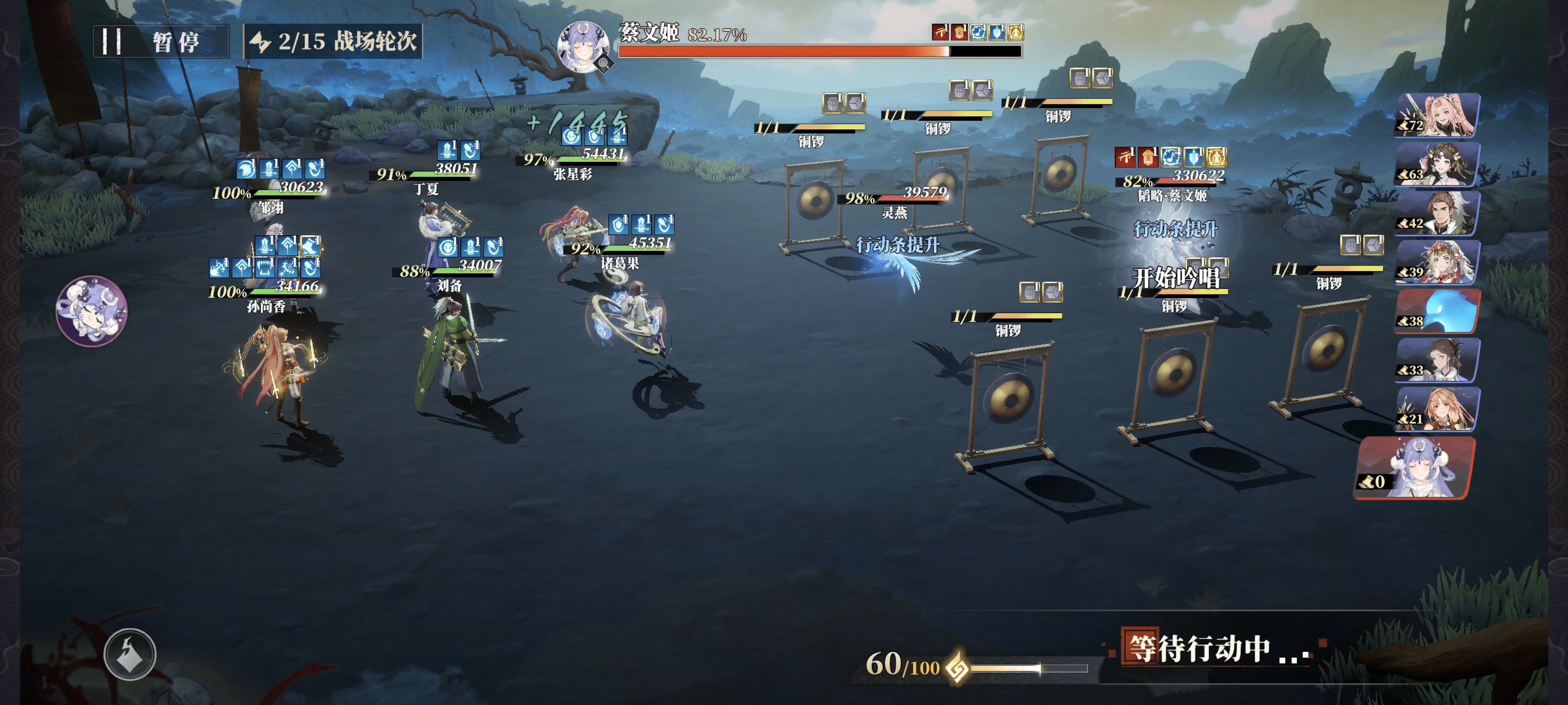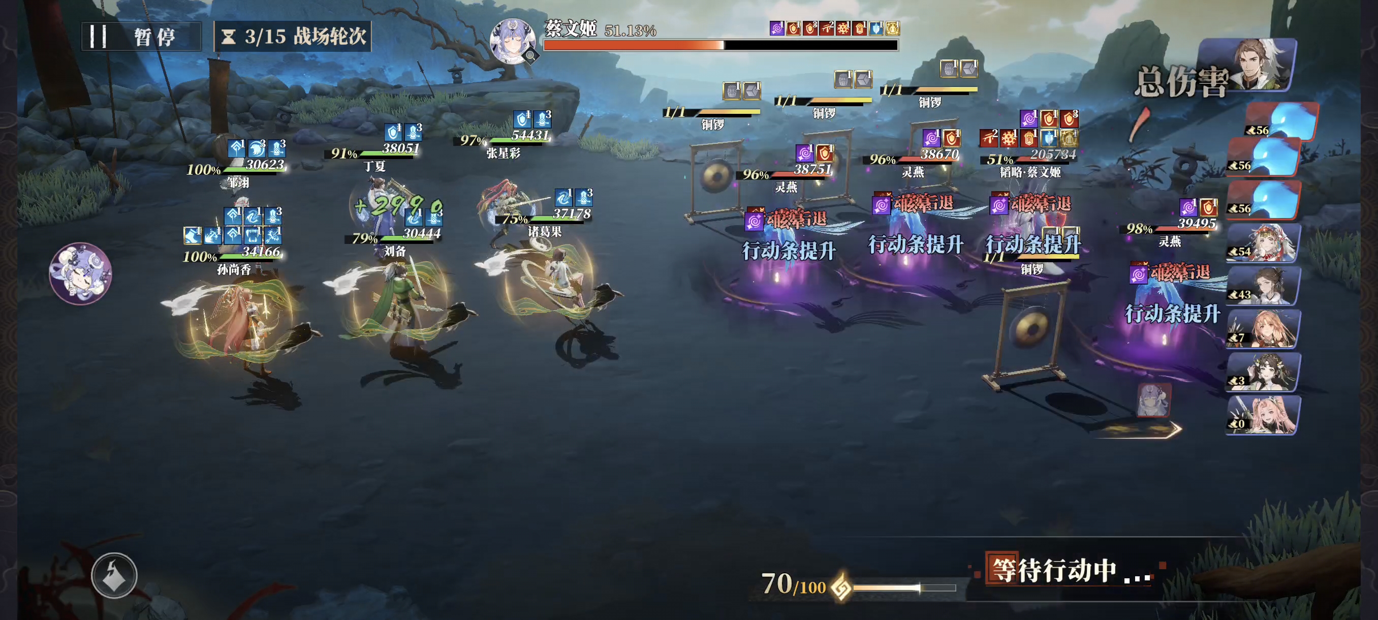 一开始蔡文姬速度很慢,拉条也不高,所以第一回合不需要打锣,第二回合时,因为孙尚香【骁将】加成还没叠起来,同时邹翊的【驭雕】还没叠到4层,无法攻击到后排,就由香香出手打掉后排的锣。