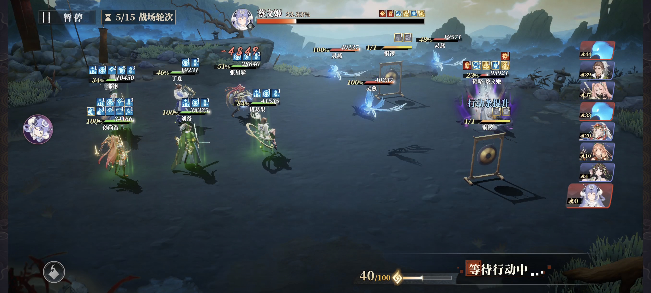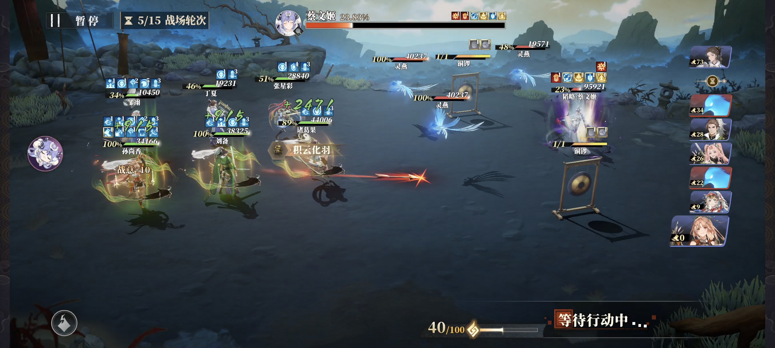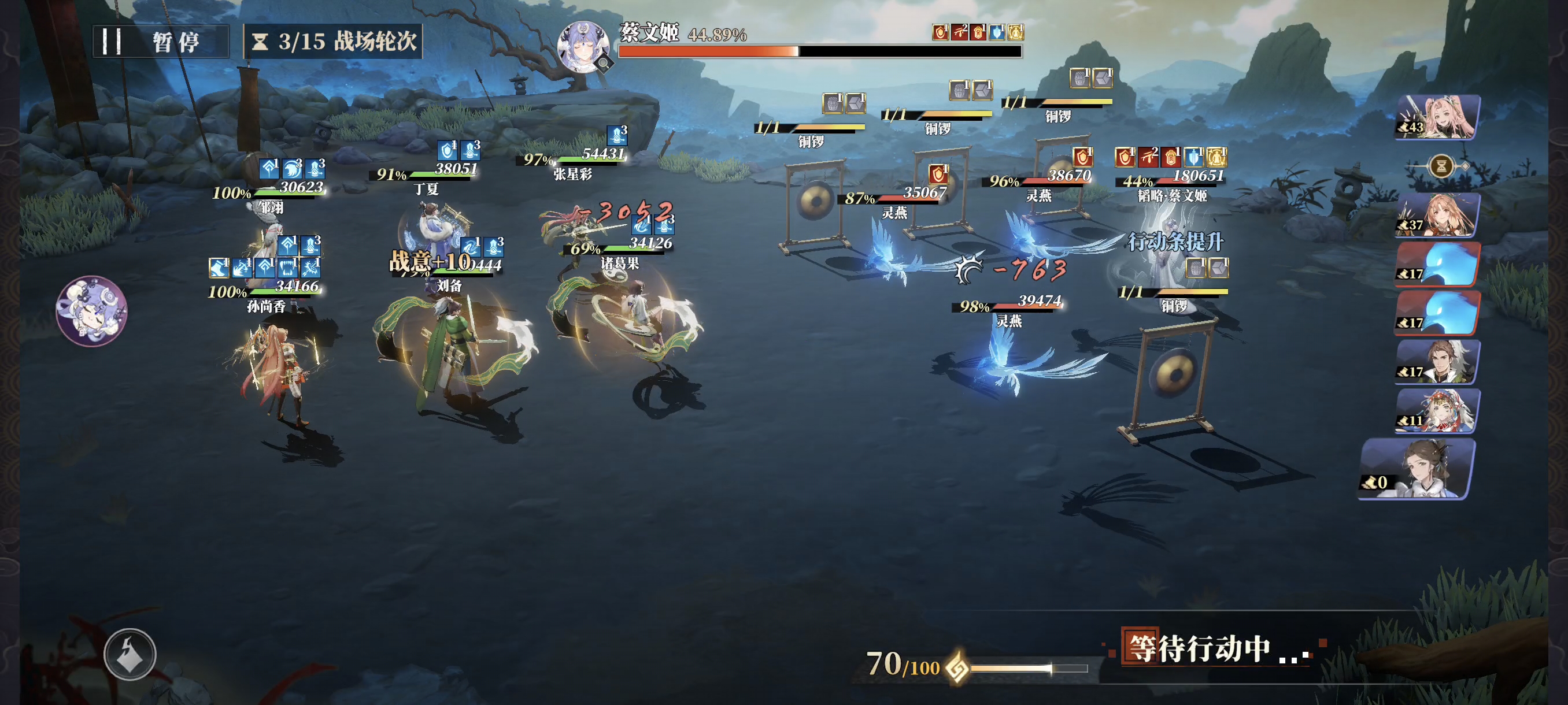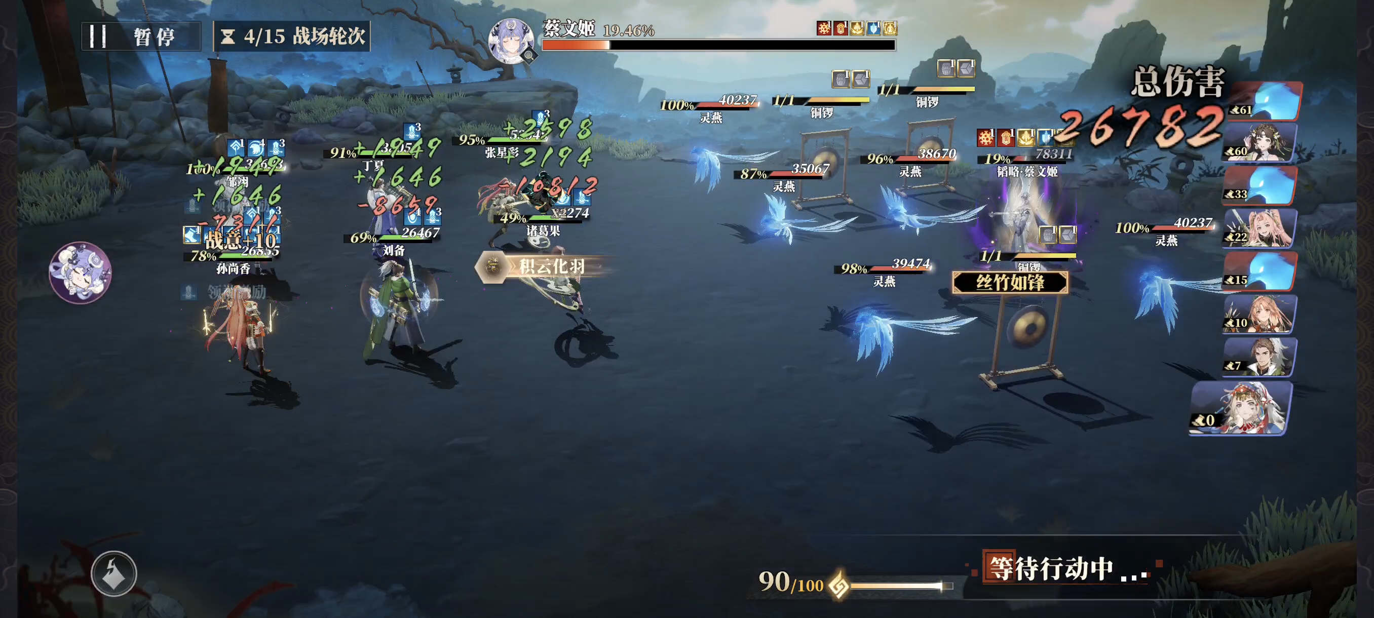 一开始蔡文姬速度很慢,拉条也不高,所以第一回合不需要打锣,第二回合时,因为孙尚香【骁将】加成还没叠起来,同时邹翊的【驭雕】还没叠到4层,无法攻击到后排,就由香香出手打掉后排的锣。
