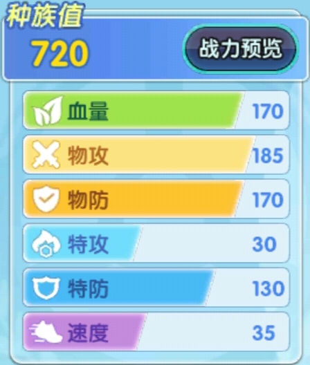 种族值分析:血量170,物攻185,物防170,特防130。血量和物攻都比较优秀了,坦度方面也可以,这也是为了特性做铺垫。因为速度缓慢,也可以配合骗术空间使用。