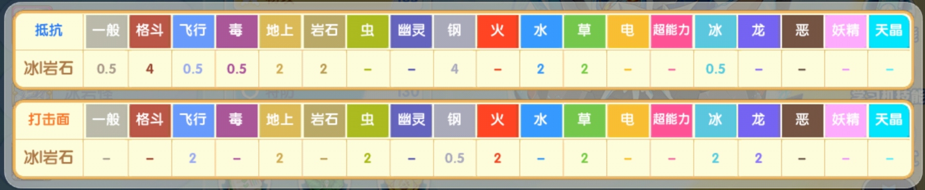 属性分析:弱点还是很多的,并且还有格斗和钢两个4倍弱点,这也是冰岩怪的硬伤。不过相比于之前的闪光冰岩怪来说,这次冰岩怪(洗翠形态)特性消除了岩石系的弱点,使得其抗性更上一层楼。