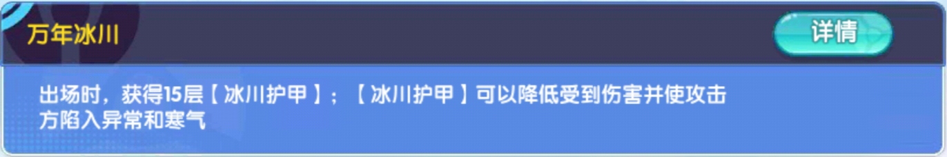 ·出场时,获得15层[冰川护甲];[冰川护甲]可以降低受到伤害并使攻击方陷入异常和寒气