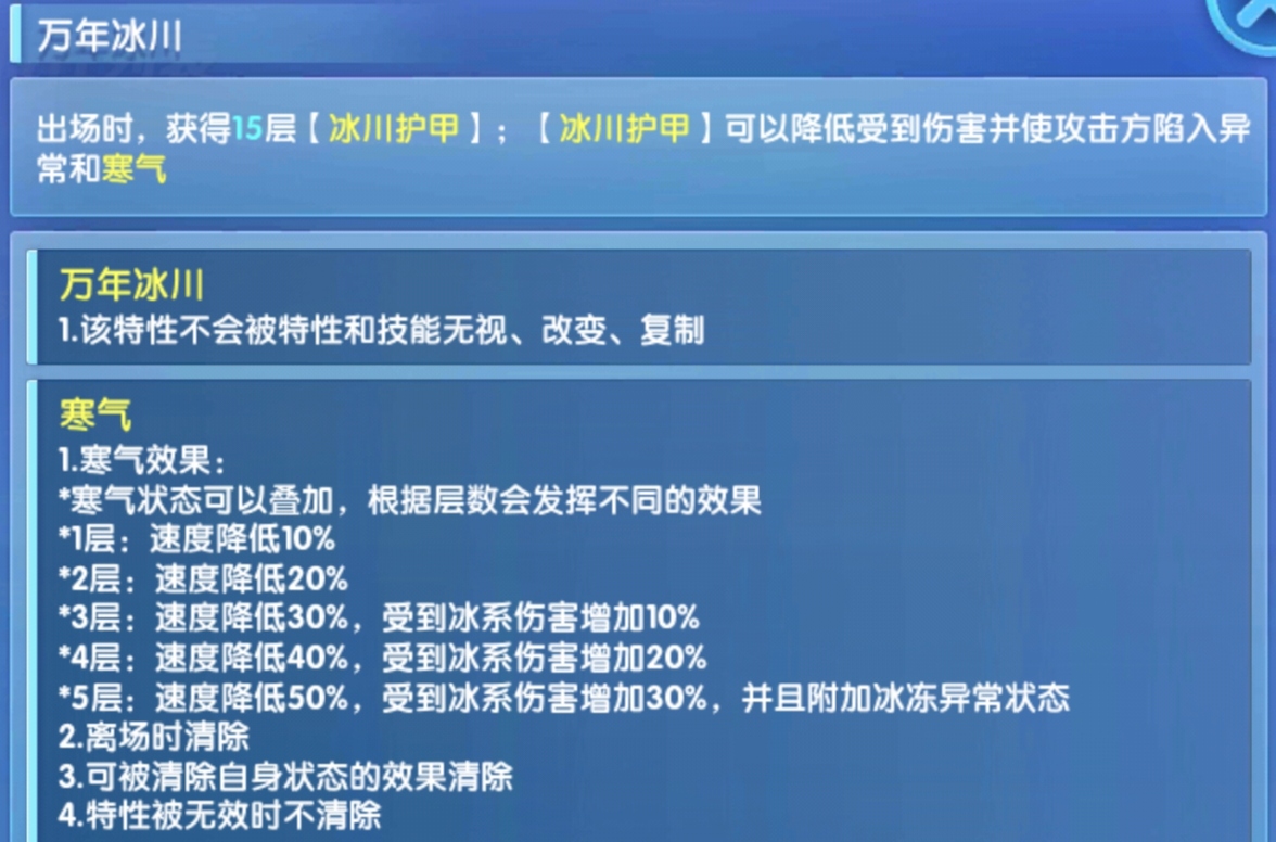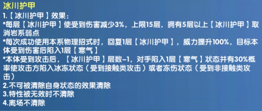 特性详解:每层[冰川护甲]可以使受到伤害减少3%,上线为15层并且拥有5层以上[冰川护甲]取消岩石系弱点,叠满15层[冰川护甲]可以达到45%的伤害减免。每次使用成功使用本系物理招式时,回复1层[冰川护甲],威力提升100%,目标本体受到伤害后陷入1层[寒气],[寒气]状态的效果在图上了,我就不重复赘述了。