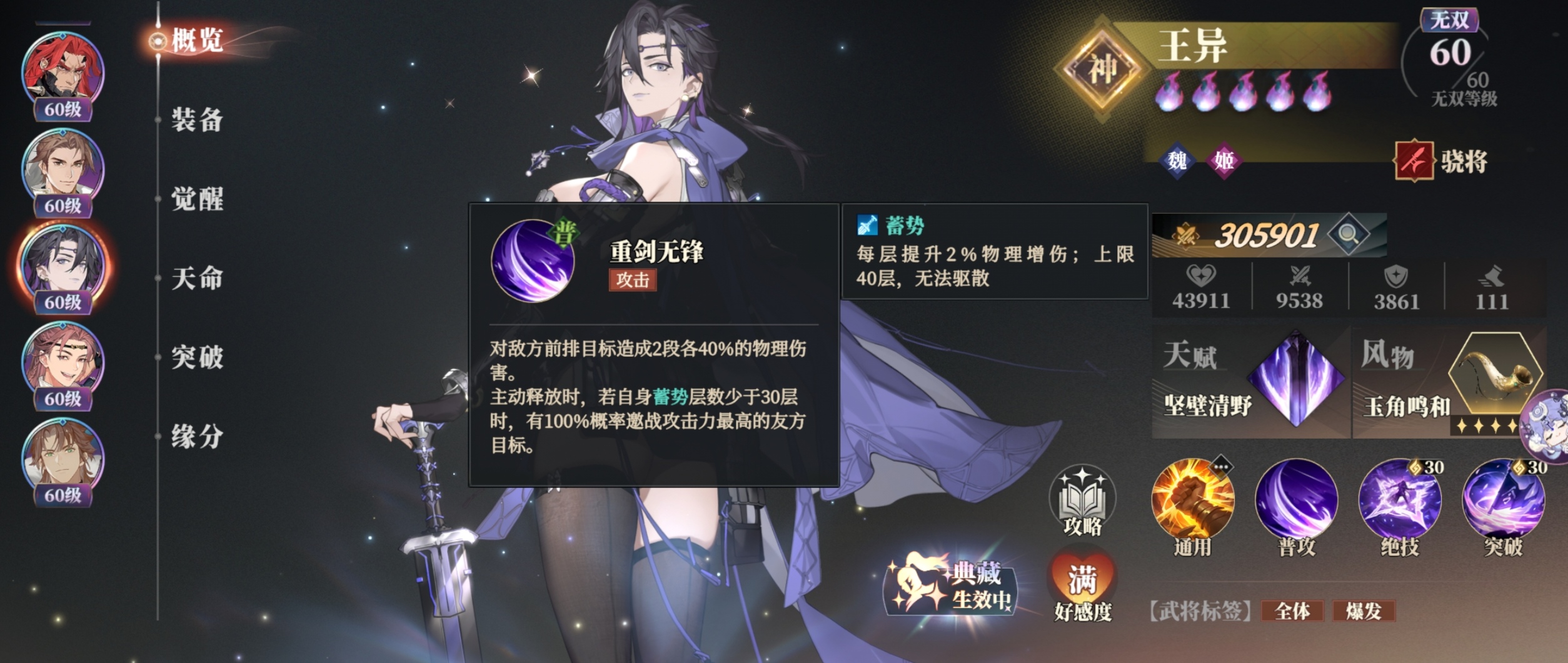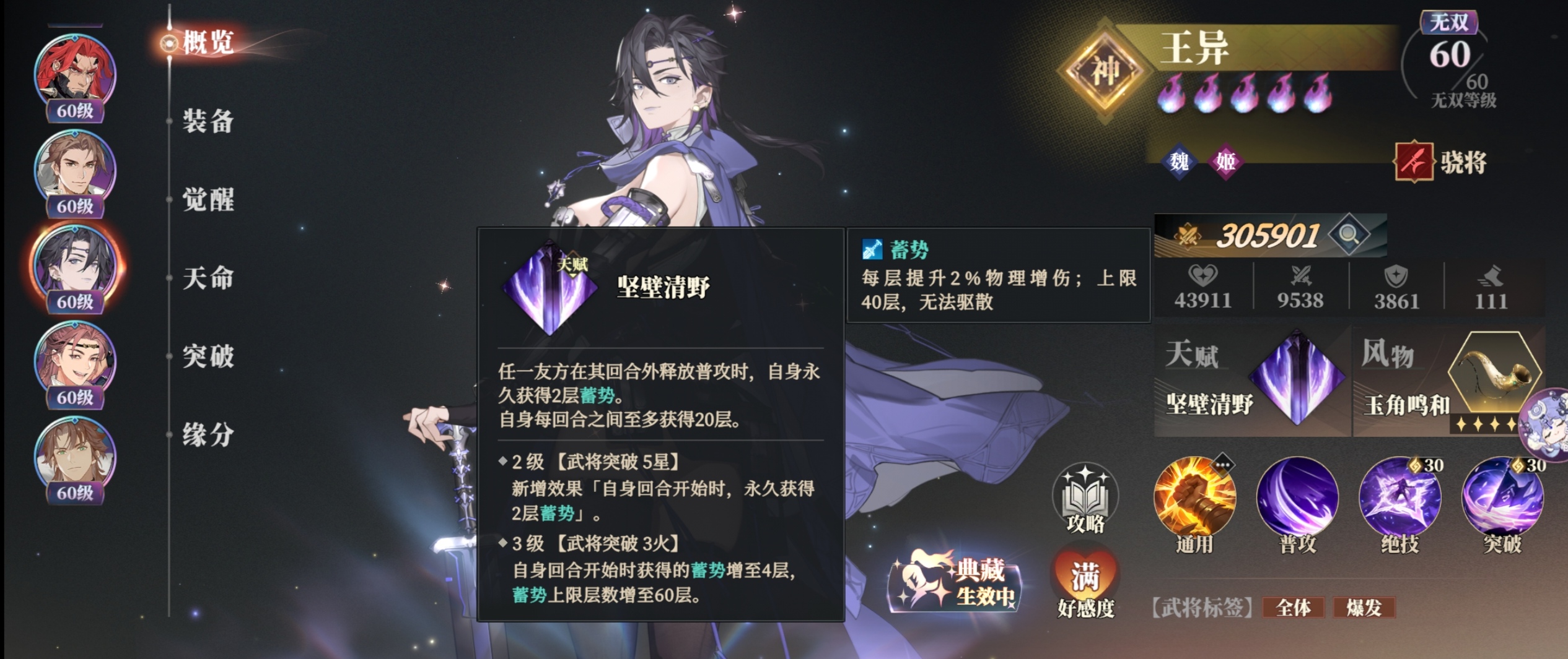 ②5星后:王异每回合开始,就可以永久获得2层蓄势。