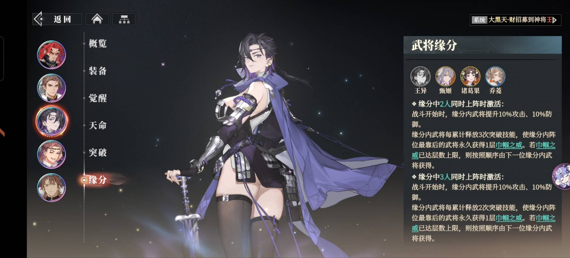 缘分内的武将释放2次突破技能,可以使缘分内阵容站位最靠后的武将永久获得1层【巾帼之威】上限2层!