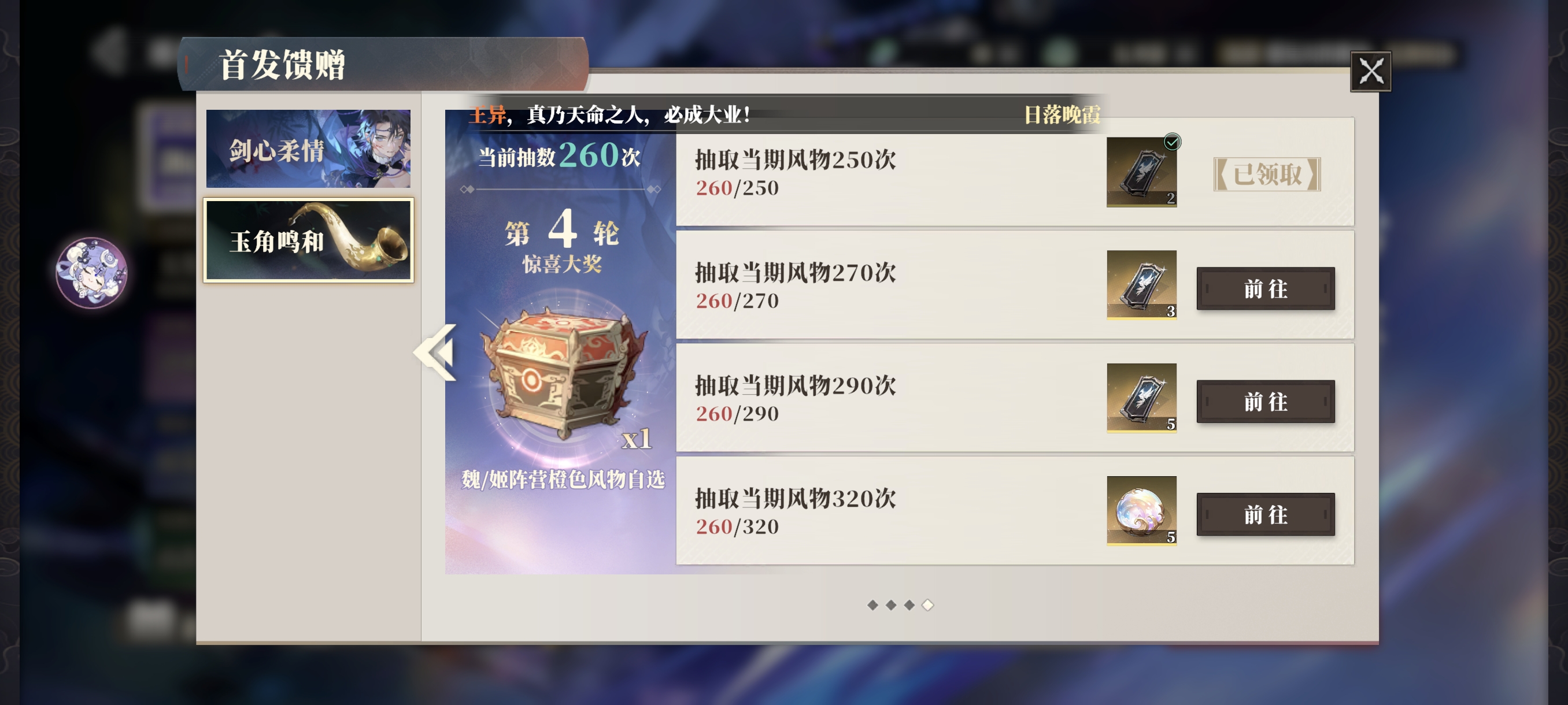风物池累抽达到160抽和320抽,可获得魏/姬风物自选箱各1个,还有大量普抽、玄龙珠赠送。
