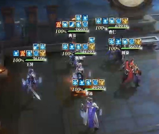 在配队上,可以上2*3的3T阵容强保王异,尤其是曹昂,非常重要,开局的2层从旁前置强行降低敌方一攻的吕布或张辽20%增伤。