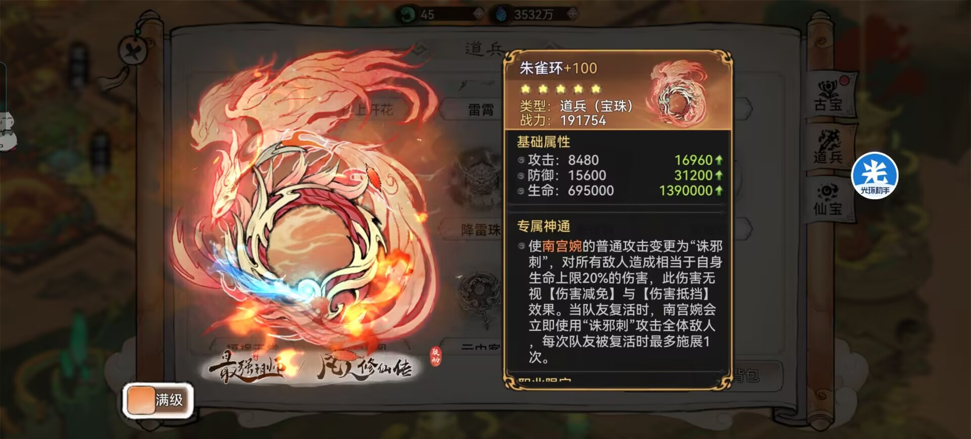 4:【输出南宫婉】道兵推荐。专属道兵:朱雀环(必带)。