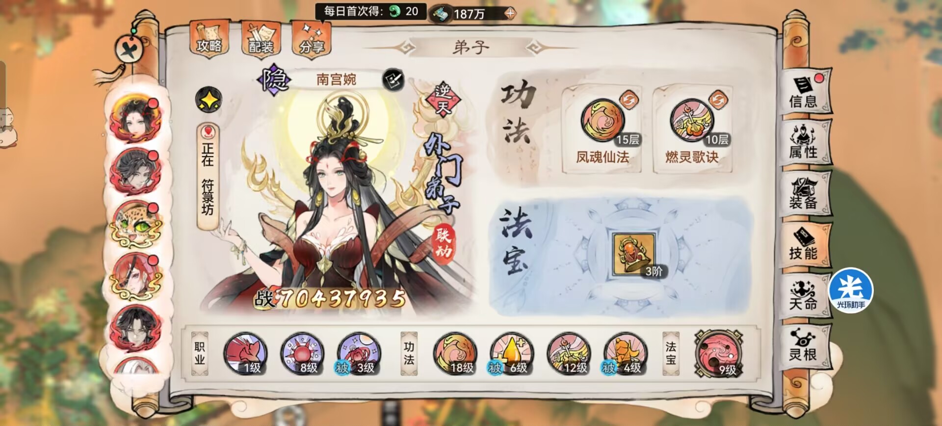 比如:把南宫婉放前排功法带【凤魂】+【燃灵】起到一个复活队友和死亡清除队友负面的团队作用效果。