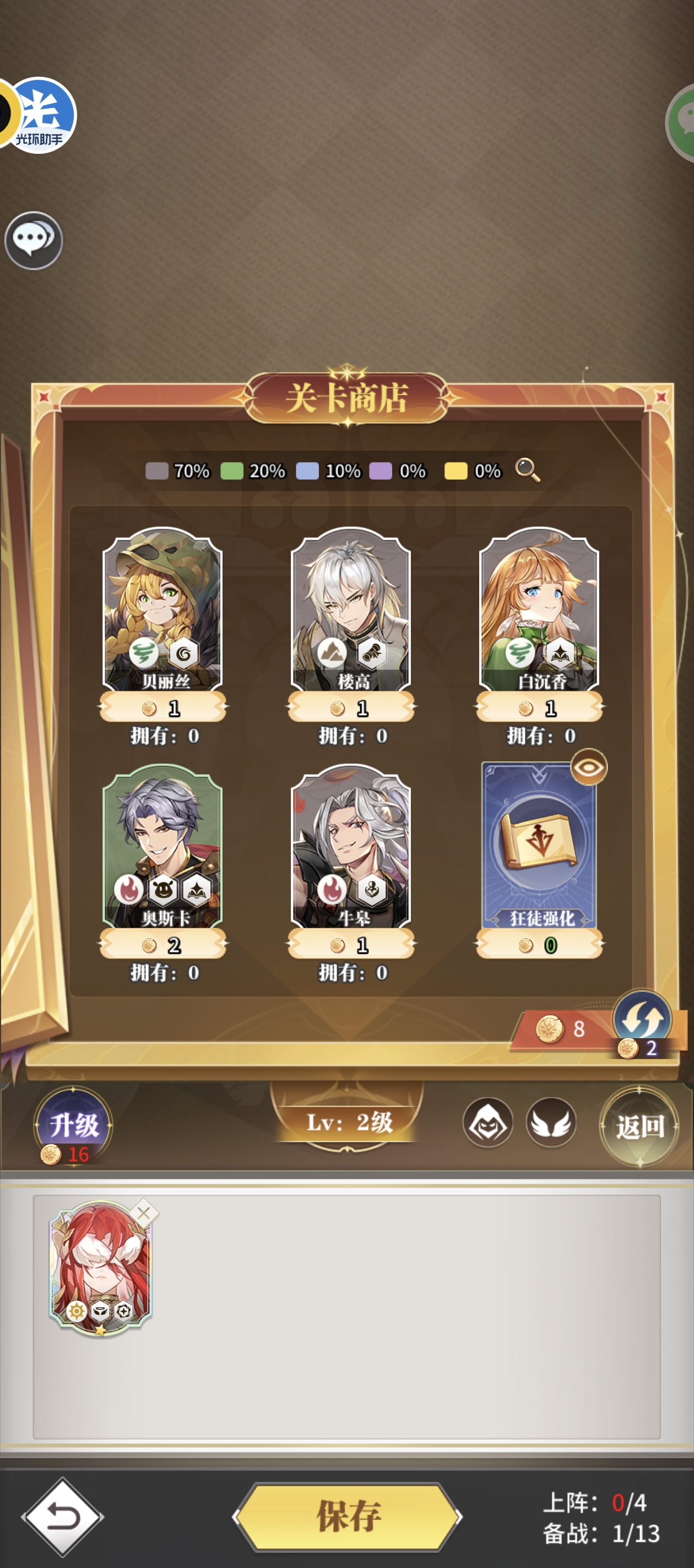 接下来是不开特权的玩家,在开局如上,寻找千寻疾,佘龙以及混沌之子三张牌,在打完三四个关卡后就可以升级上人口,以人口优势过关,同时在商店中搜索光系或者暗系的牌,最好能在第九关之后能升到七人口,开出三光三暗的羁绊,只需卡30块的利息即可。打完第一个大关卡之后自选拿到天使,随即和上面特权玩法类似。需要注意的是,如果实在打不过可以等几天,卡牌的强化等级上去了再打,没必要一直重复刷。再打每一关之前都最好切换界面去看看对面的质量如何,从而确定是否升星以及补羁绊