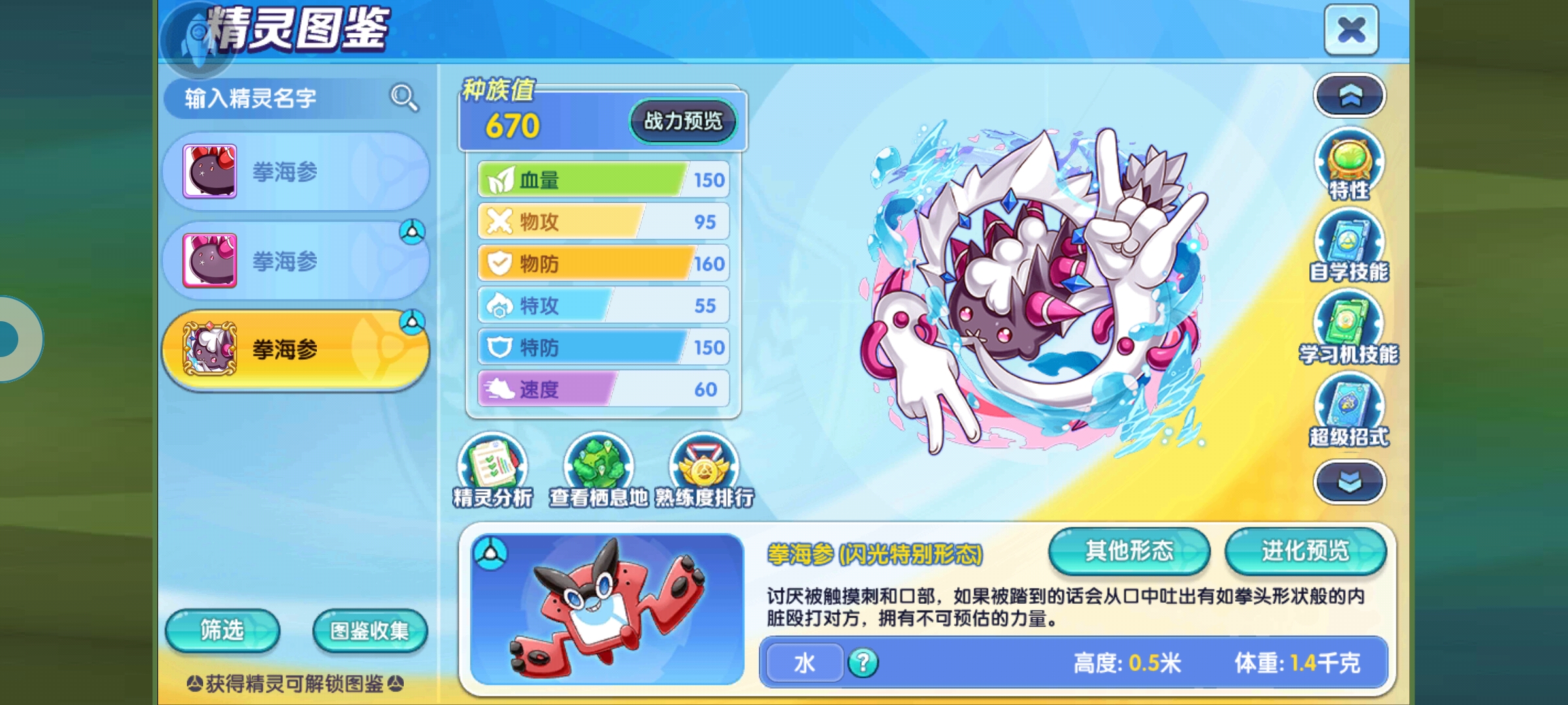 总结:这么长时间来,我一直等待着拳海参的新形态,不过新形态或者皮肤都没给,但是,这次拳海参的加强其实也还是挺满意的,偏向肉度加功能性,主要还是防止骚扰,总体看起来还是相对满意的,可以作用于针对,,队伍怕上述情况的可以选择加入拳海参,但是也有遗憾,就是种族依旧不高,遇到太暴力的宠还是不好防,另外拳海参的样子也挺可爱,颜值党也可以携带,不过萝卜青菜各有所爱,样子只是一个方面,更重要的还是实力,如果大家对它也感兴趣,可以留言讨论。