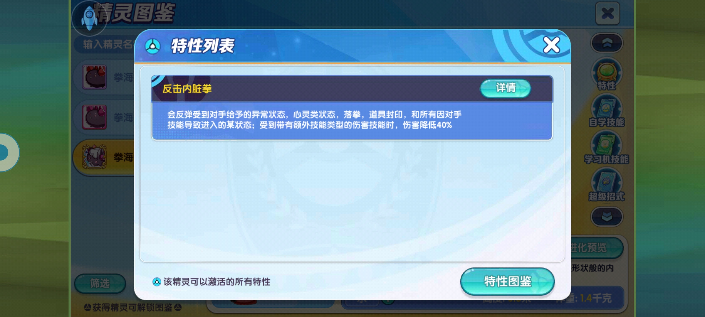 拳海参真正的灵魂在特性,反击内脏拳会反弹受到对手给予的异常状态,心灵类状态,落拳,道具封印,和所有因对手技能导致进入的某状态,受到带有额外技能类型的伤害技能时,伤害降低40%,这里注意,比如召唤火对拳海参使用睡眠粉,拳海参则反弹睡眠转移至召唤火身上,但是如果对方是替身状态,那就转移到替身时候会无效,尤其要注意,特性触发的状态不能转移,比如阿柏怪的猛毒,拳海参打到会中猛毒,不会反弹,还有布钉、满地星等以场地为对象的技能也不会触发该特性,而只要是技能触发的基本能够转移,比如狂风的每回合扣血可以转移,抛媚眼的着迷也可以转移,并且对方不会触发下场,心灵类状态石化功,假指控,挑拨,回复阻挡,着迷,再来一次、落拳和道具封印状态也会把该状态反弹。