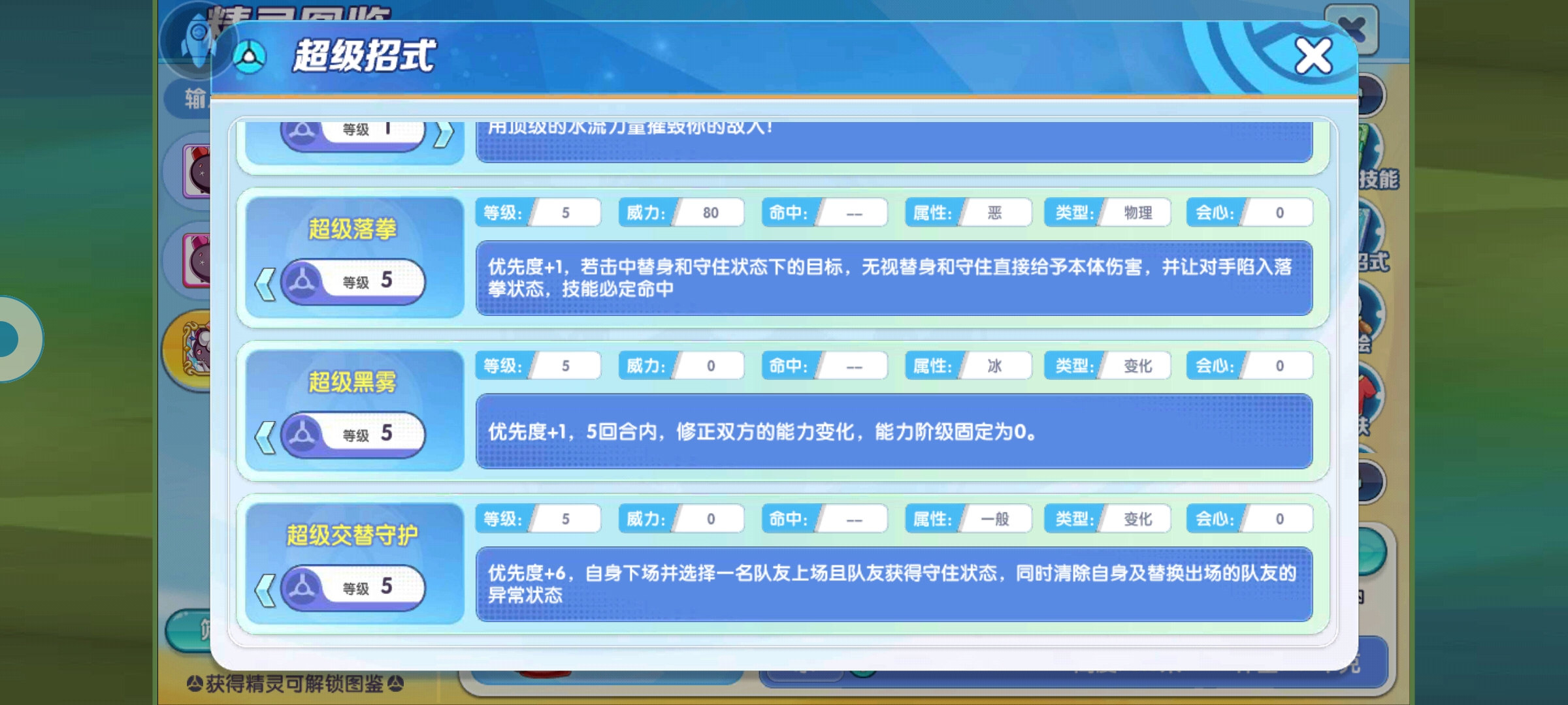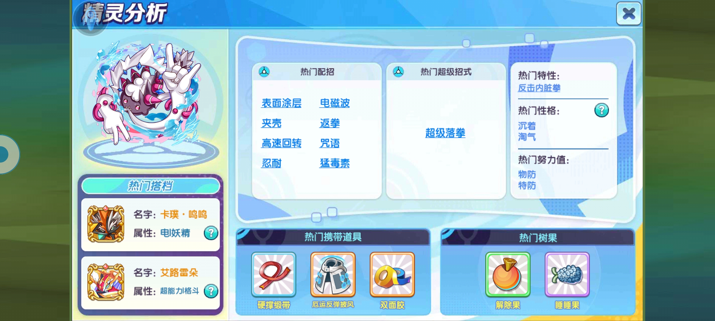 它有4个z技能,这几个里面个人建议选择超级黑雾或者超级落拳,在实战中可以先制,因为速度低,有时候先制能发挥出不错的作用。尤其超级落拳,直接强制先手打落道具,如果对方残血的时候也可以反制翻盘。
