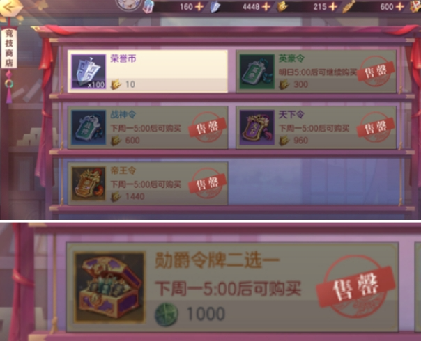 ③高级:各类头衔令牌→神将碎片任选,有富余荣誉勋章可购买部分刻印石;