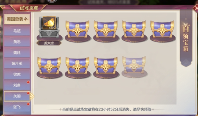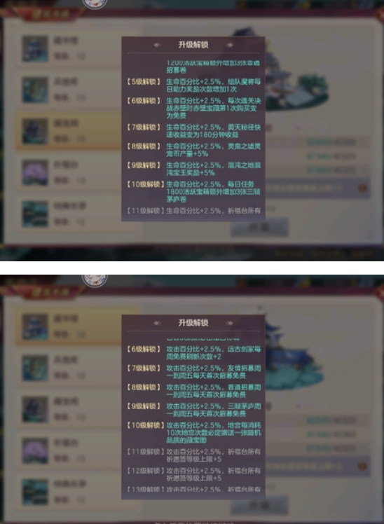 5、山河建筑,优先将藏书楼和藏宝阁升到10级。效果分别为:10次地宫给1个藏宝图(随机品质);活跃赠送招募券及三顾券。