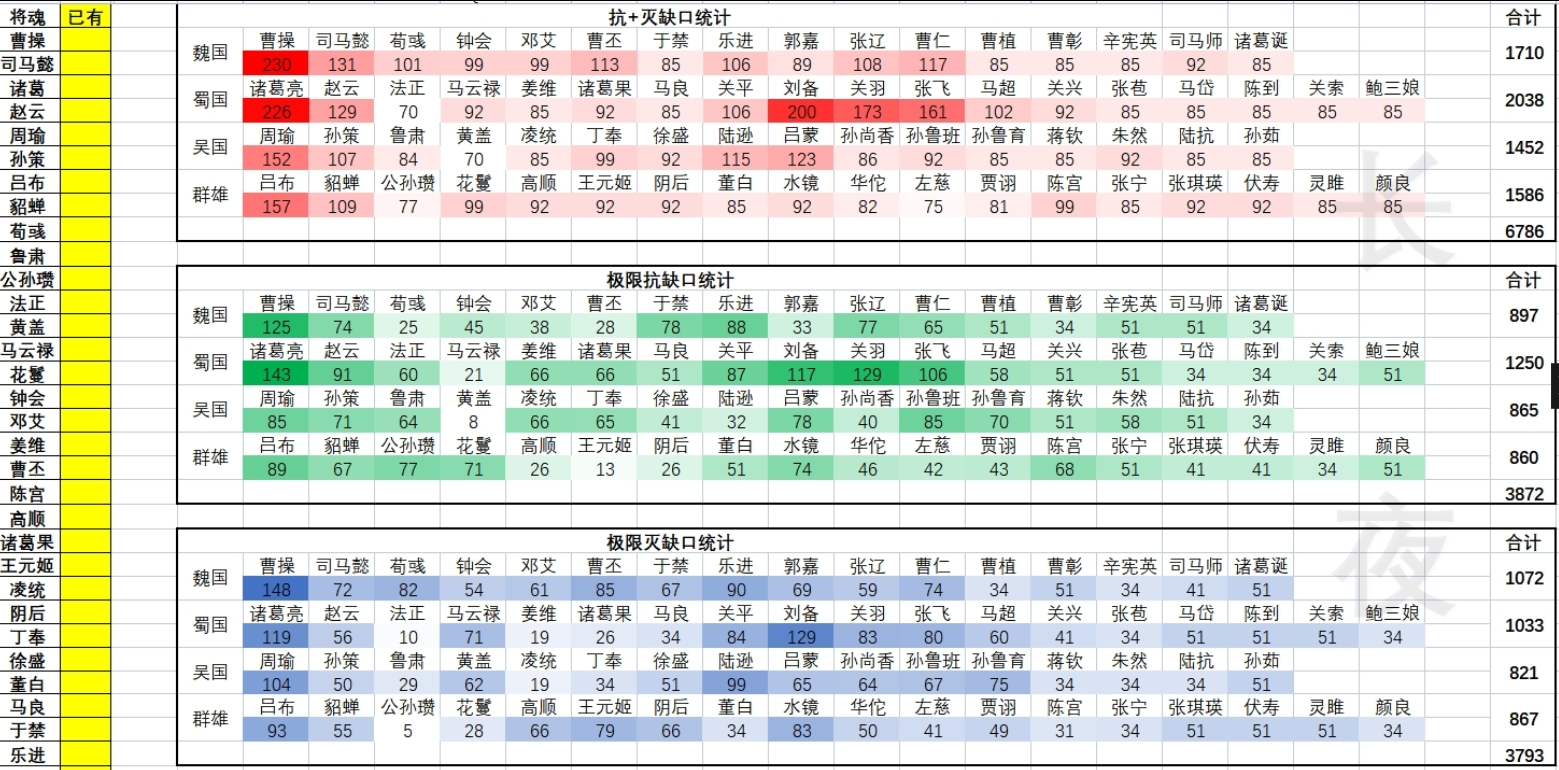楼主做了个将魂录缺口的计算工具(查看之前的将魂录工具贴),建议玩家可以根据自己已有的将魂,按缺口,以此从高往低补,这样可以有效控制将魂溢出,快速提升战力。