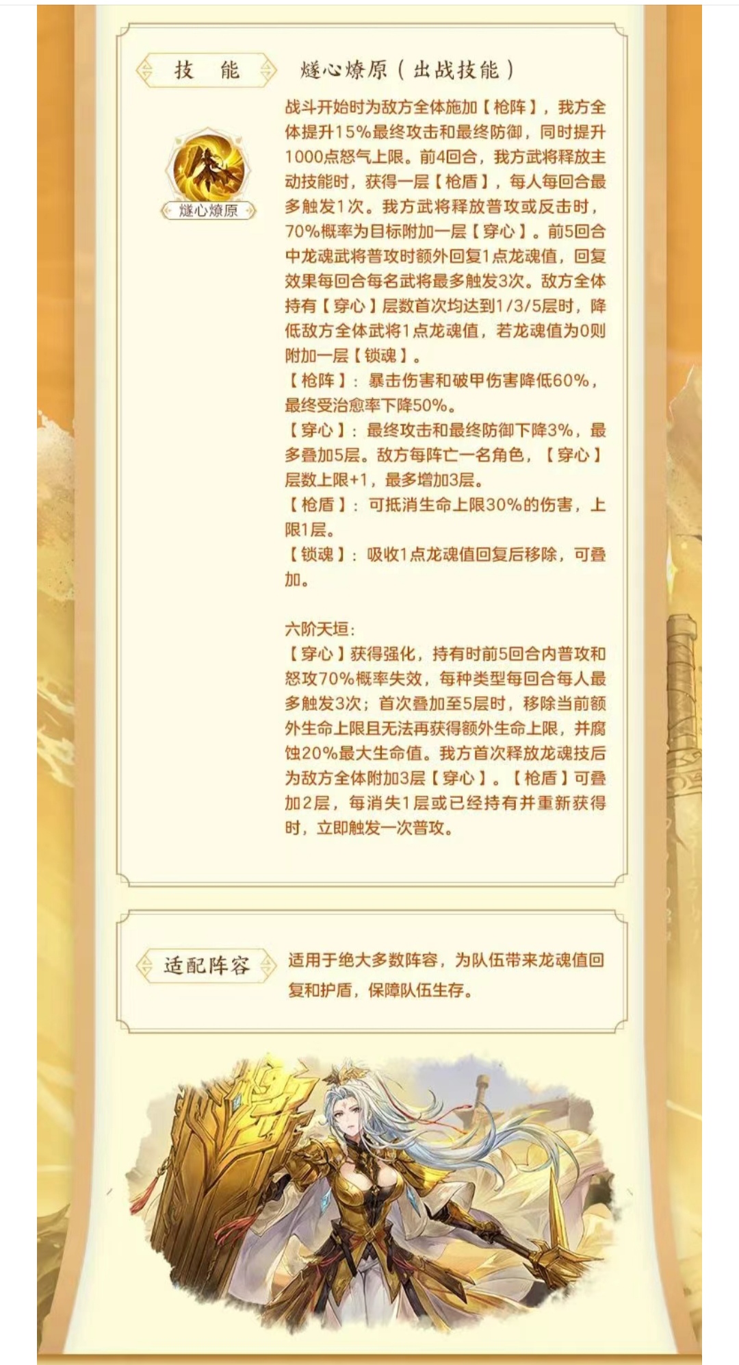 ⑤6阶时,我放首次释放龙魂技能会给对面附加3层“穿心”,如果是高打低的情况下,且对面没枪灵,基本上这局对面是没多少机会放出龙魂技能了,然后被套上“穿心”时前5回合内70%概率普攻和怒攻失效,“穿心”5层时还会清除生命上限增加效果,且无法再获得生命上限增加效果。