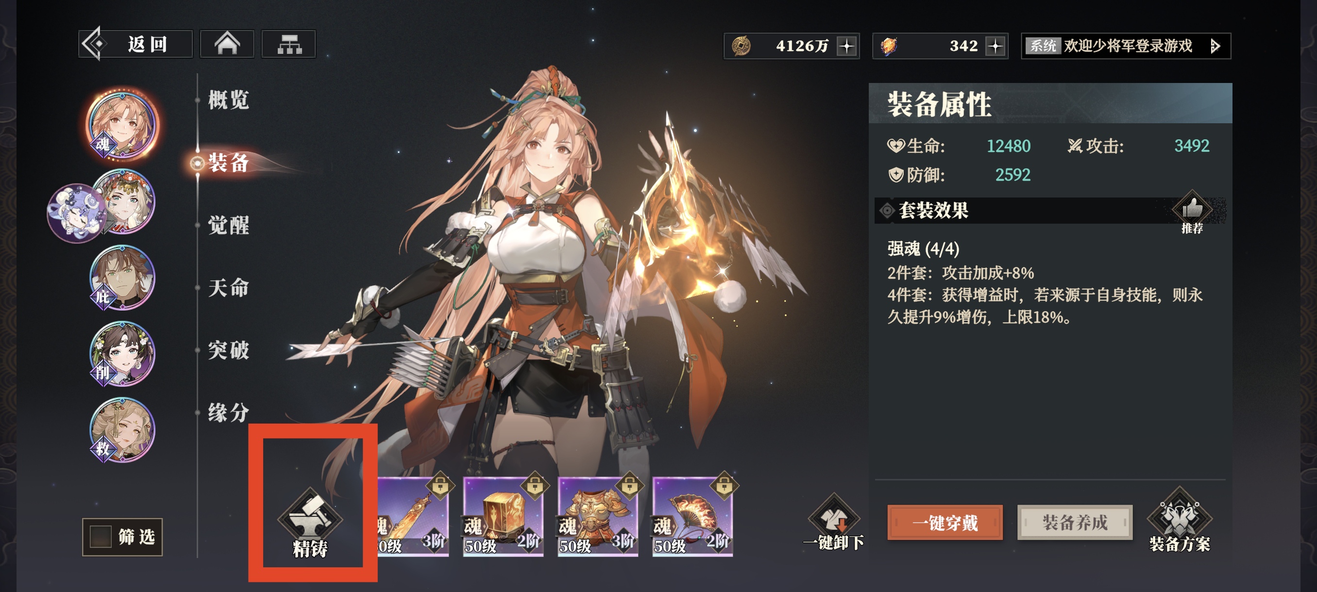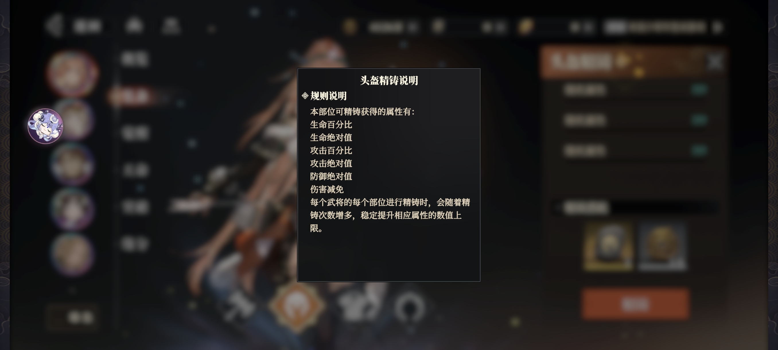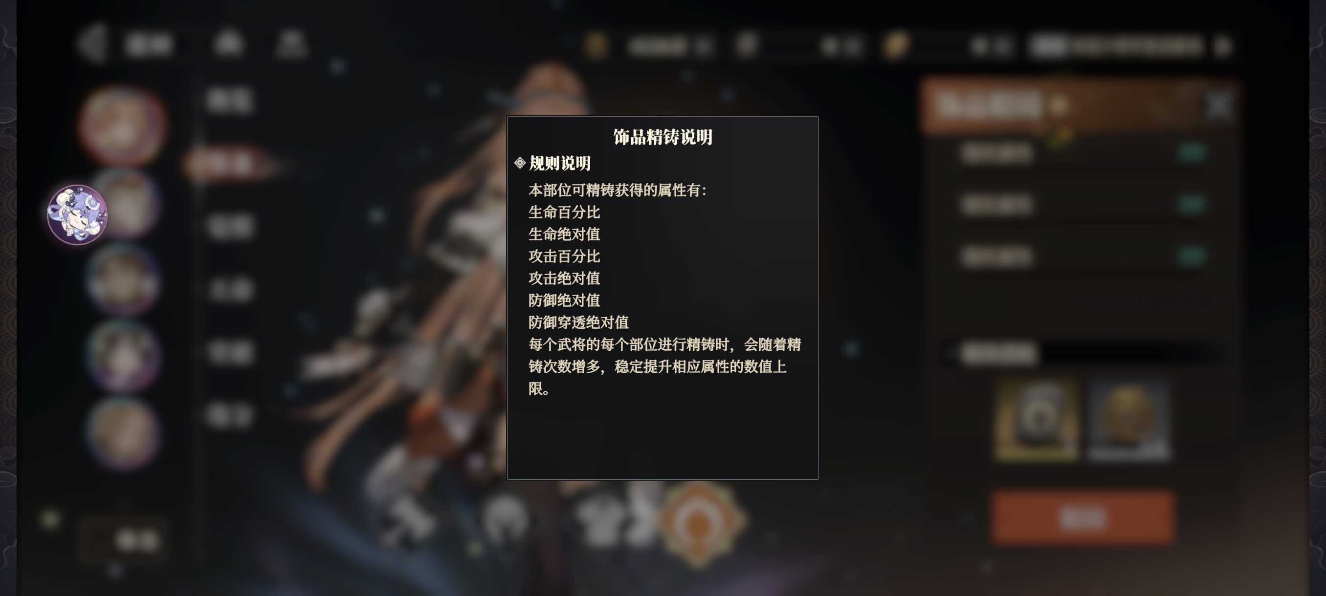 进入精铸界面的入口在武将-装备界面左下角。2、装备位置与精铸属性