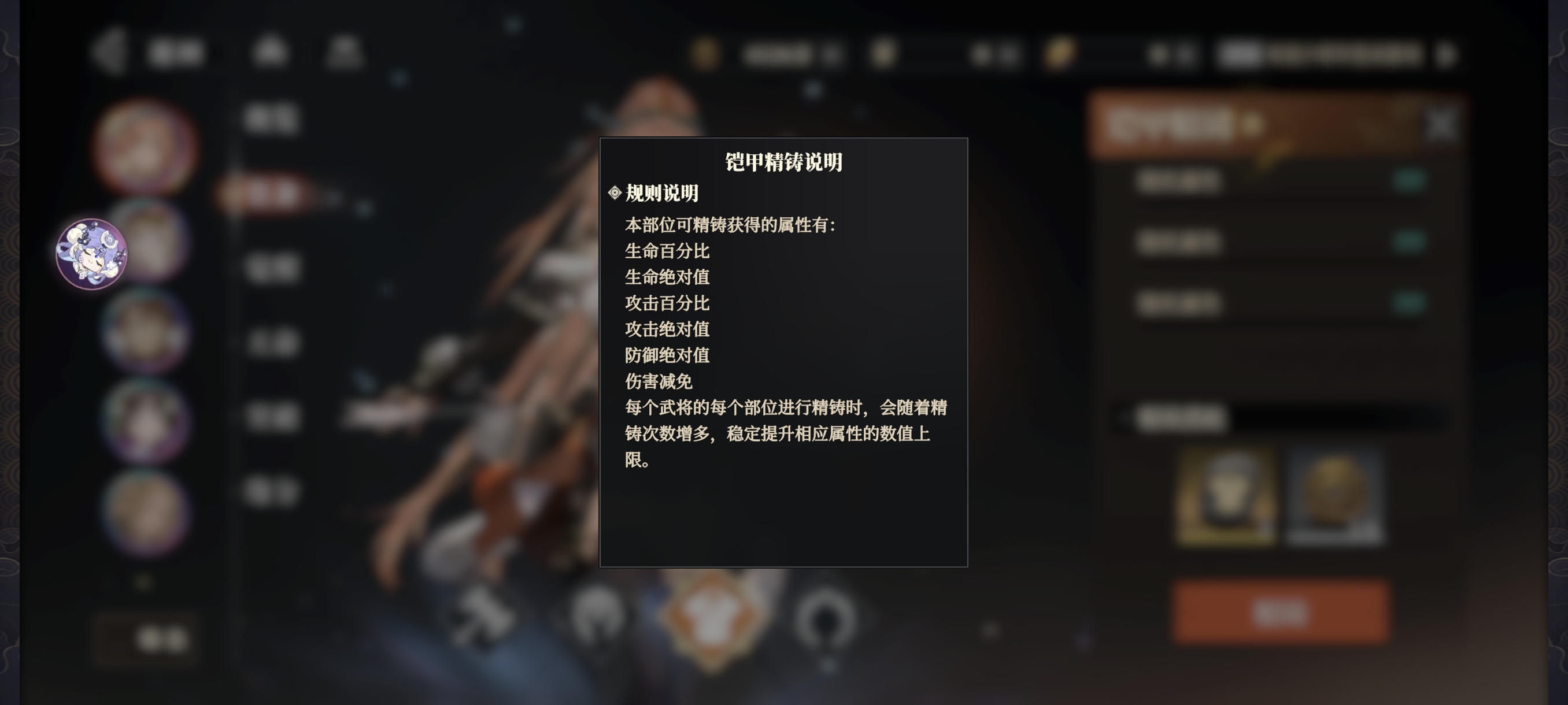 ①、精铸是直接养成装备位的属性,与武将本身绑定(类似于天命),不随更换装备而改变精铸养成属性。