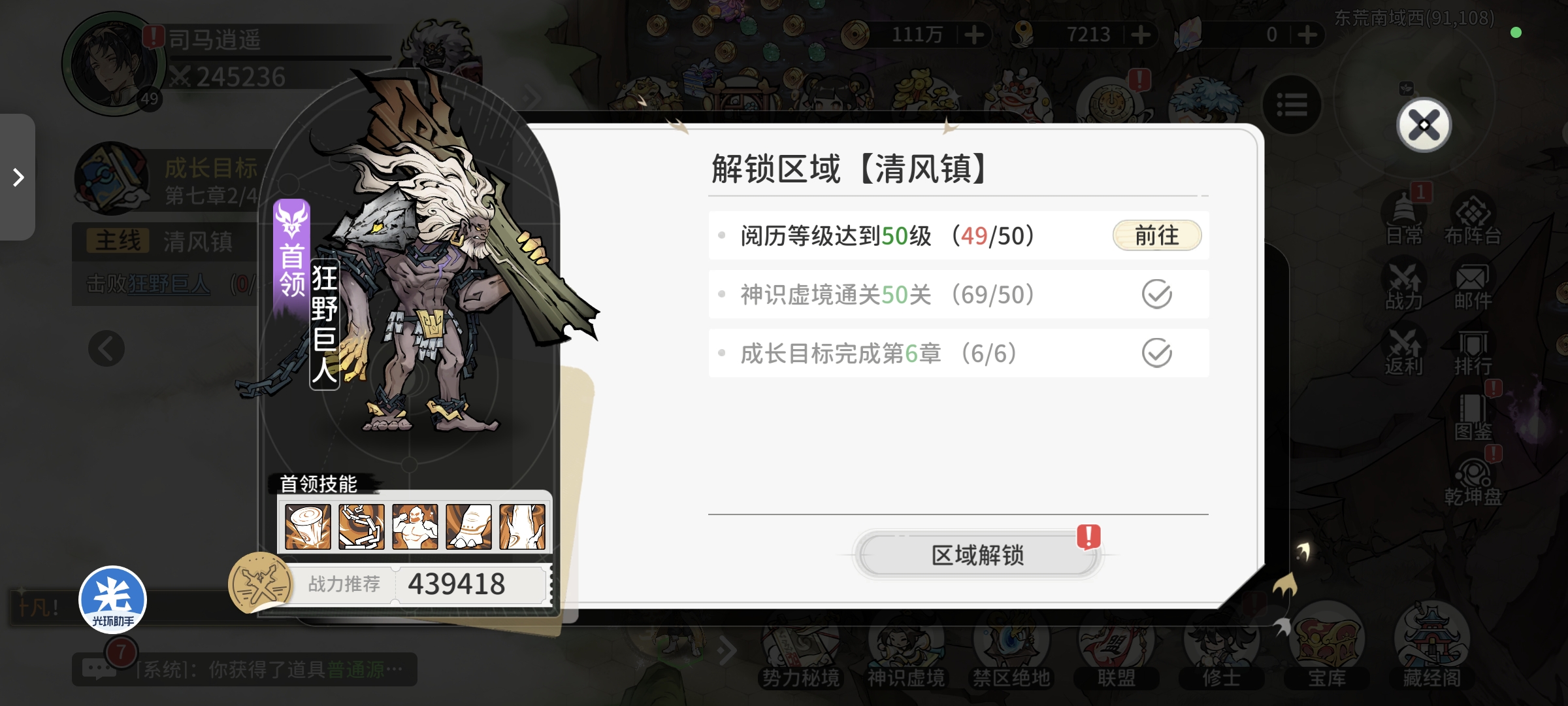 进行试炼塔挑战获取部分经验等级达到46级开启主线副本,跟随主线副本推图至狂野巨人,神识虚境可以通关60层达到69层,等级达到49级,整合其他资源最终战力达到25万(如果开区较早第二天可以开启仙道圣墟玩法,进行修士功法培养战力可以达到30万+)