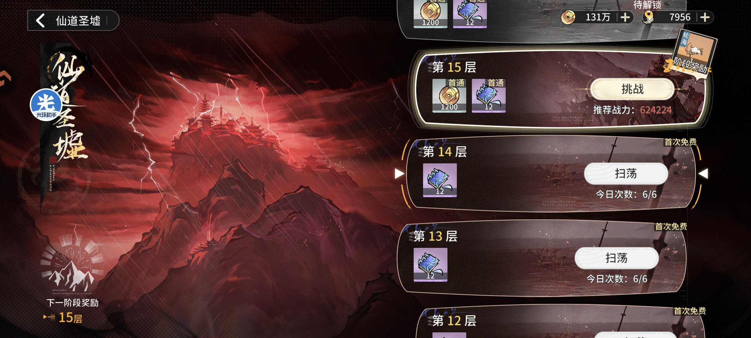 仙道圣墟每5层为一个阶段,第五关会对战力有一定要求且挑战难度会更大,核心关卡节点主要给予橙色修士功法,普通关卡则给予修士功法强化资源,前期修士功法会拉开主力和其他修士战力差距,培养相对重要,如果想保证第二天优势尽可能升至50级