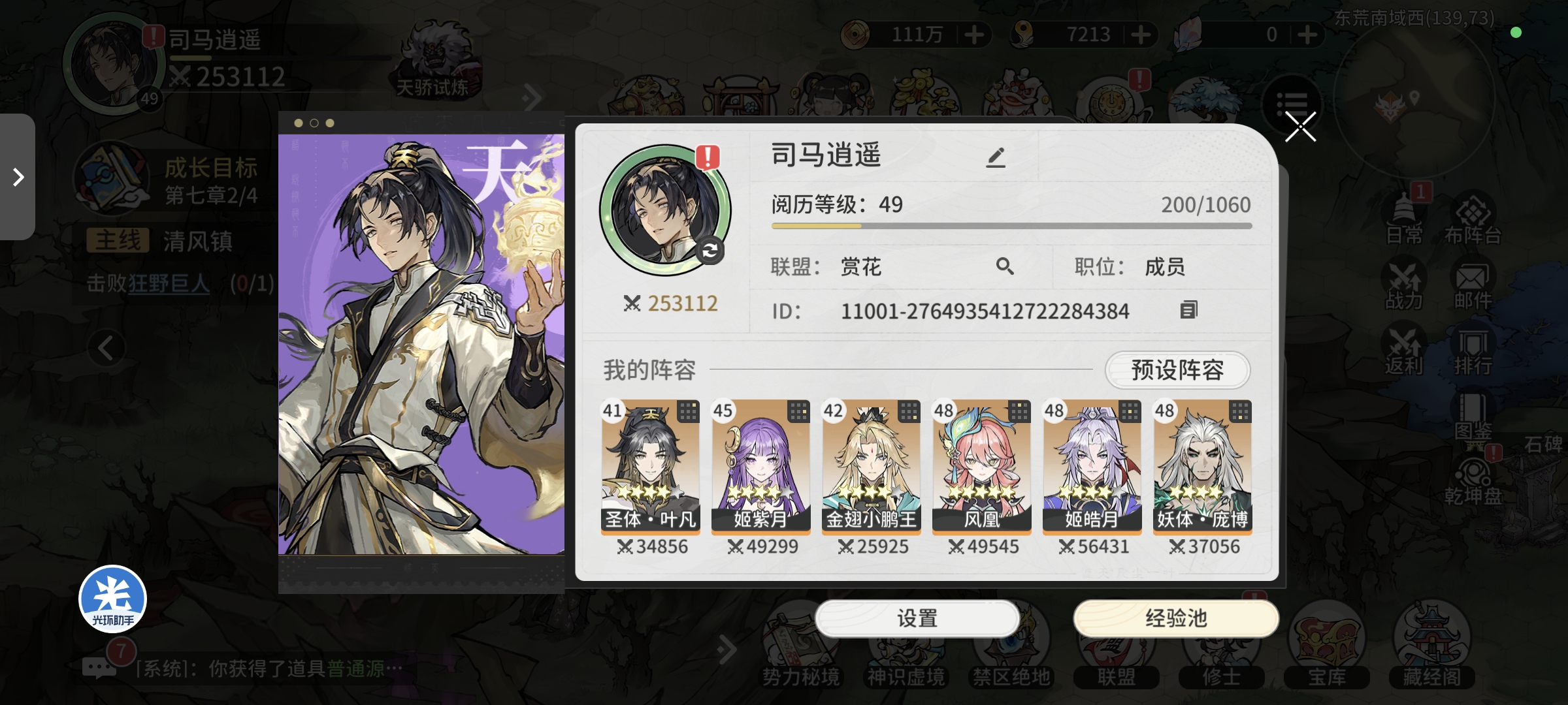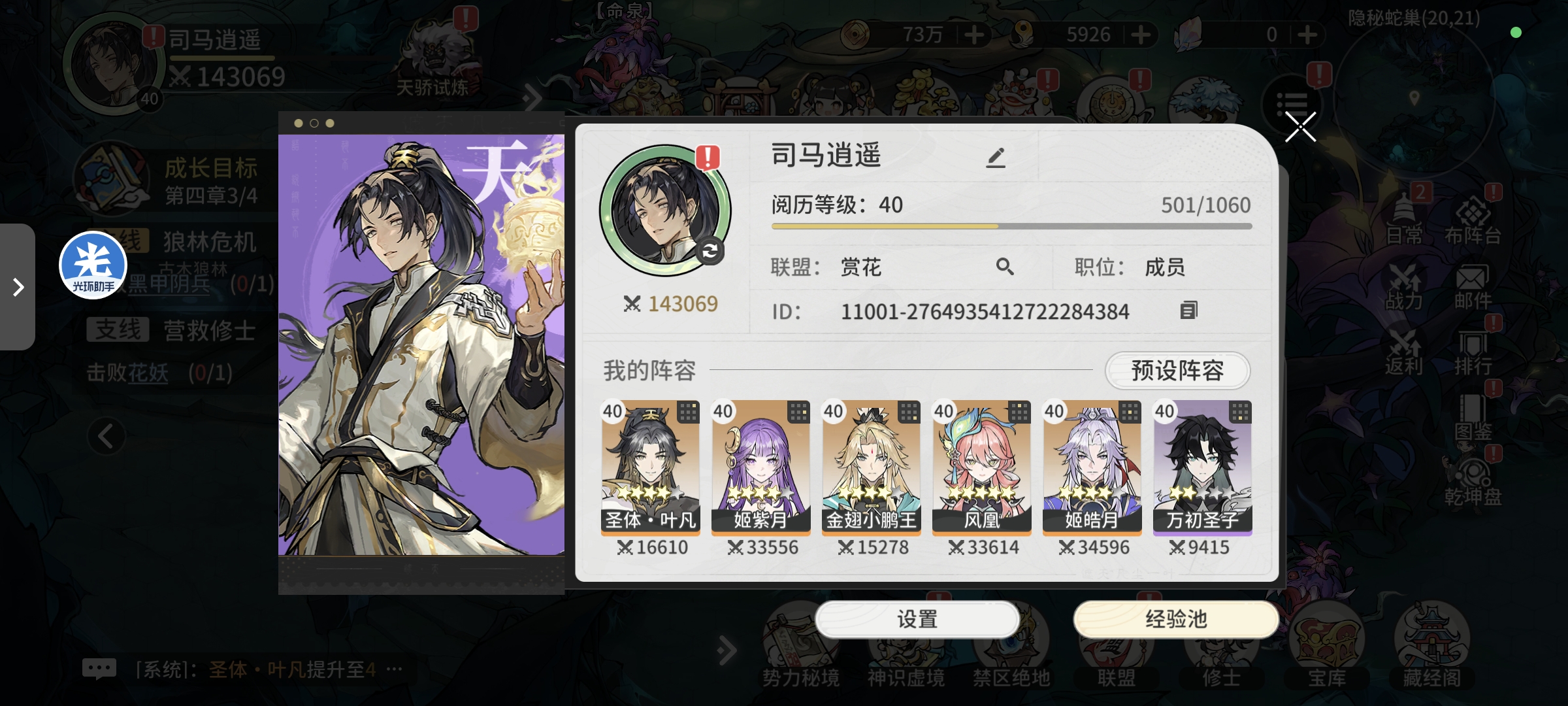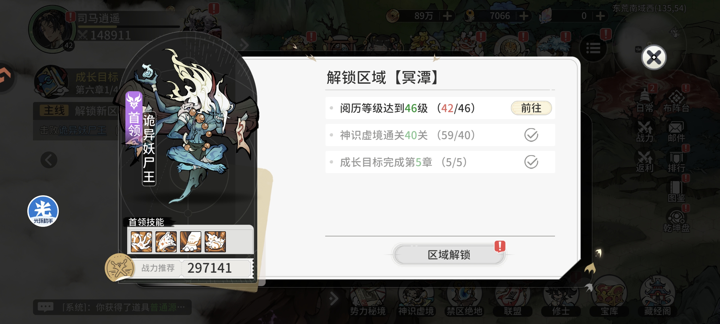 第二天领取挂机经验等级达到40级(18H左右挂机经验,模拟第一天早上进入游戏状态)开启势力秘境玩法,同时领取第二天登录奖励自选橙色修士,可以实现5橙色修士阵容,进行修士等级提升和突破,战力提升至14万,神识虚境通关59层,跟随主线任务进行挑战,等级提升至42级,主线任务卡在诡异妖尸王
