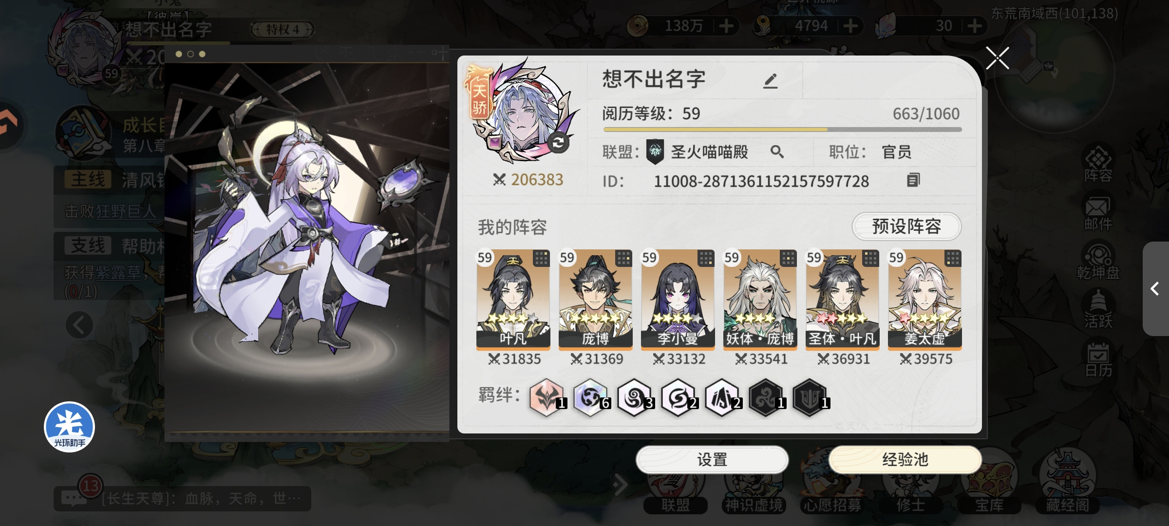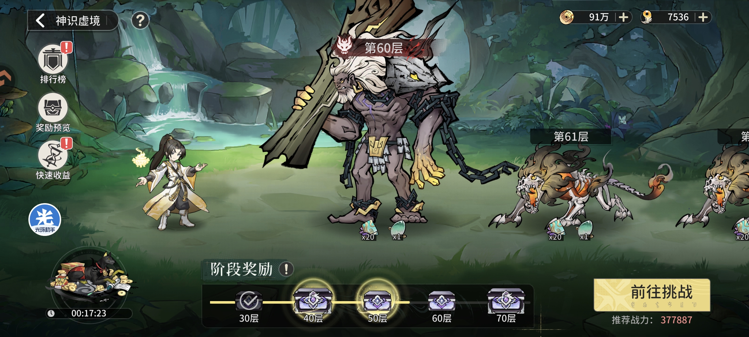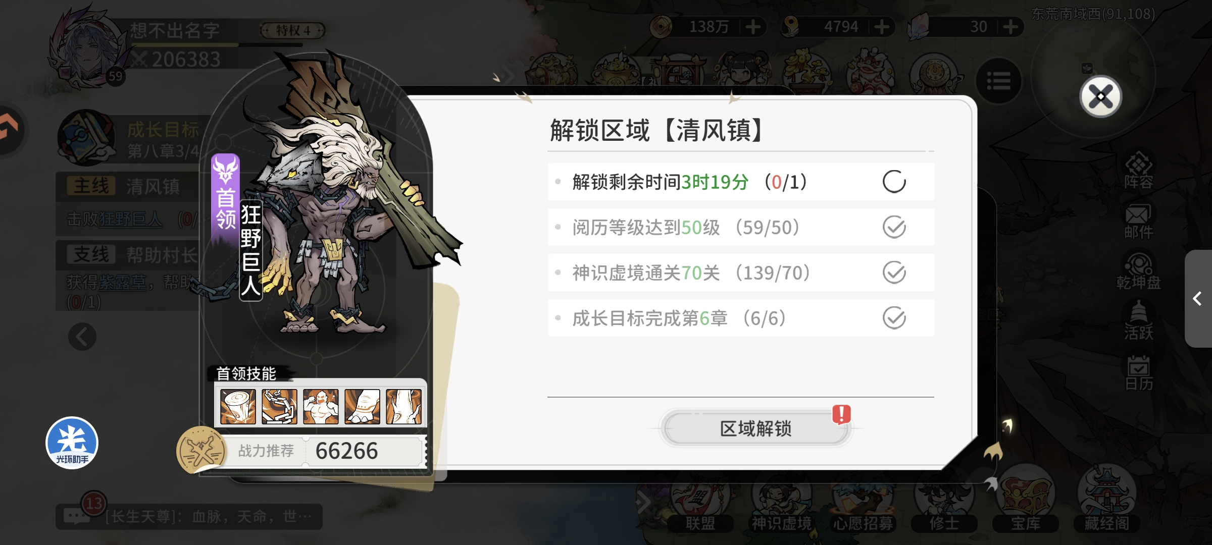 第二天领取挂机经验等级达到40级(18H左右挂机经验,模拟第一天早上进入游戏状态)开启势力秘境玩法,同时领取第二天登录奖励自选橙色修士,可以实现5橙色修士阵容,进行修士等级提升和突破,战力提升至14万,神识虚境通关59层,跟随主线任务进行挑战,等级提升至42级,主线任务卡在诡异妖尸王