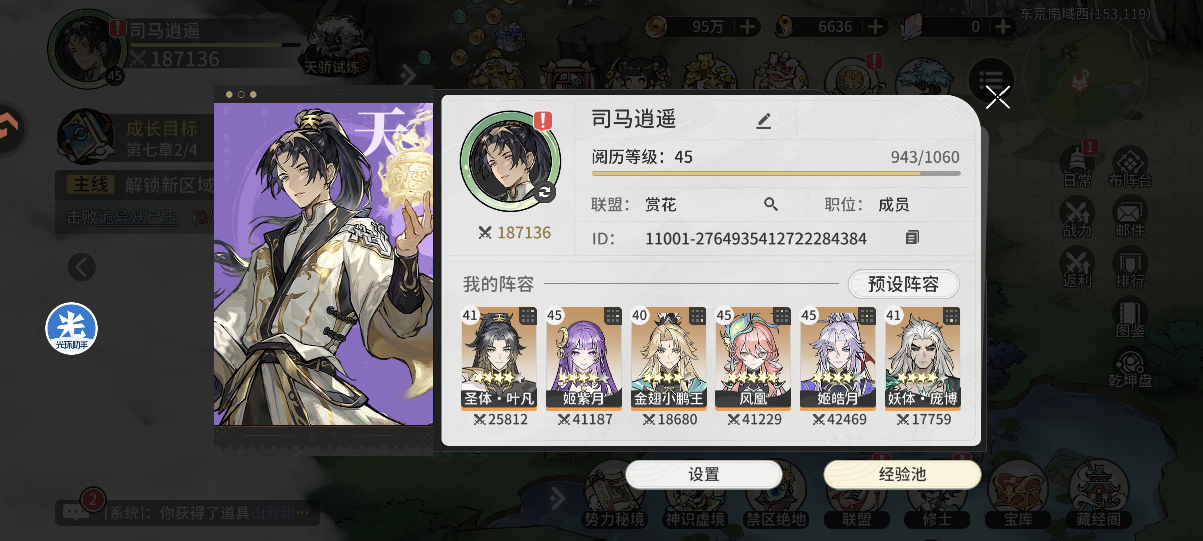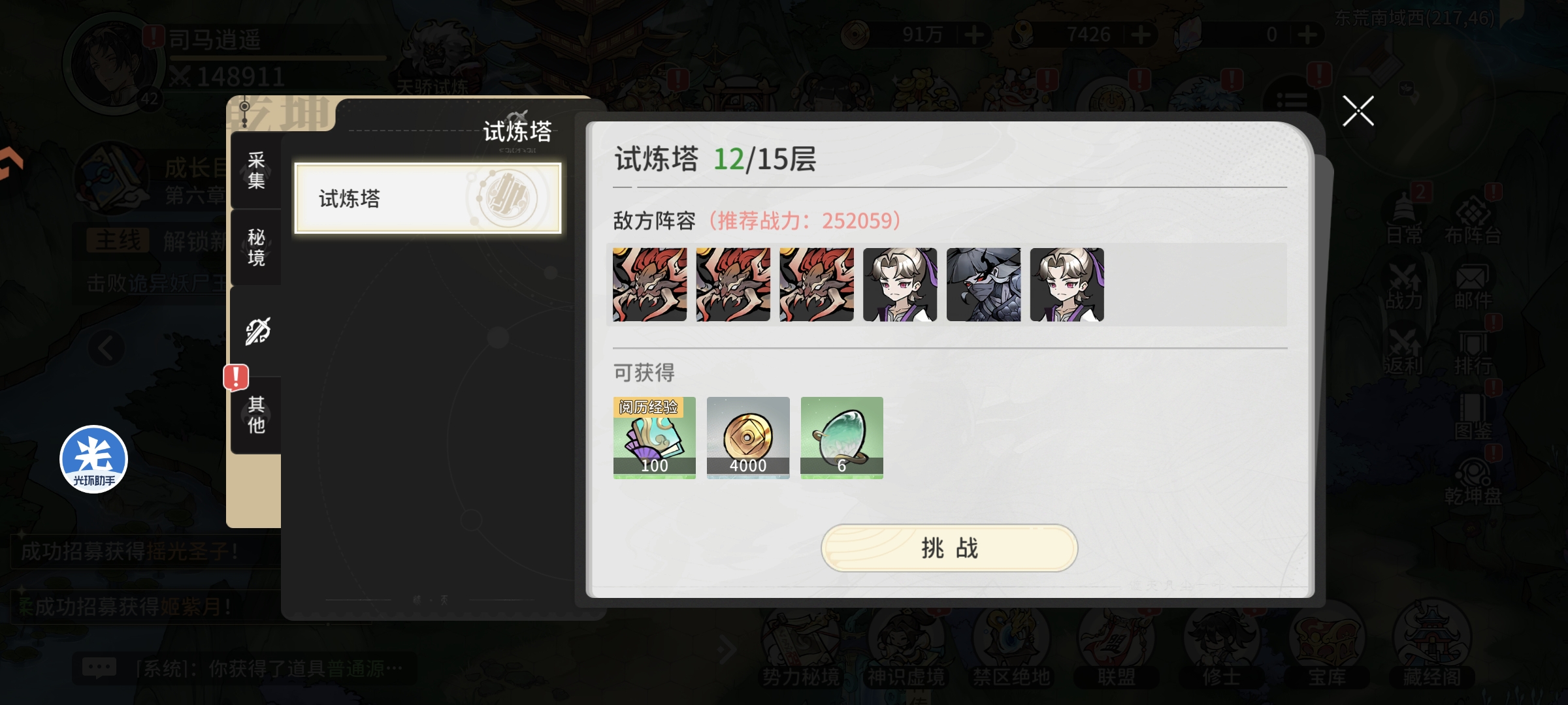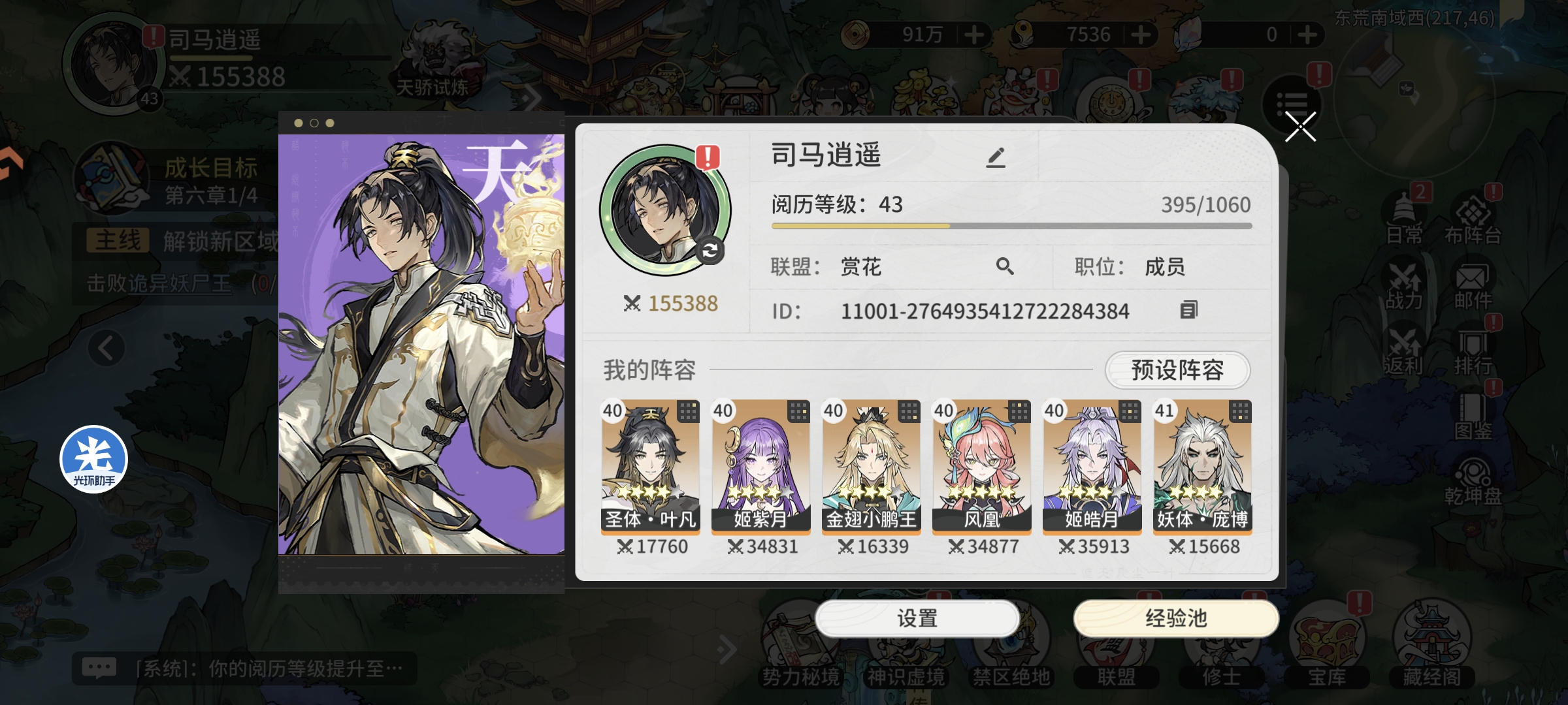 进行天骄试炼挑战,单次伤害可以达到130万左右,每次通关可以获取7个蓝色好感道具,提升仙缘等级并进行试炼塔挑战,完成地图小怪和精英怪挑战获取修士升级资源,等级达到43级战力提升至15.5万+