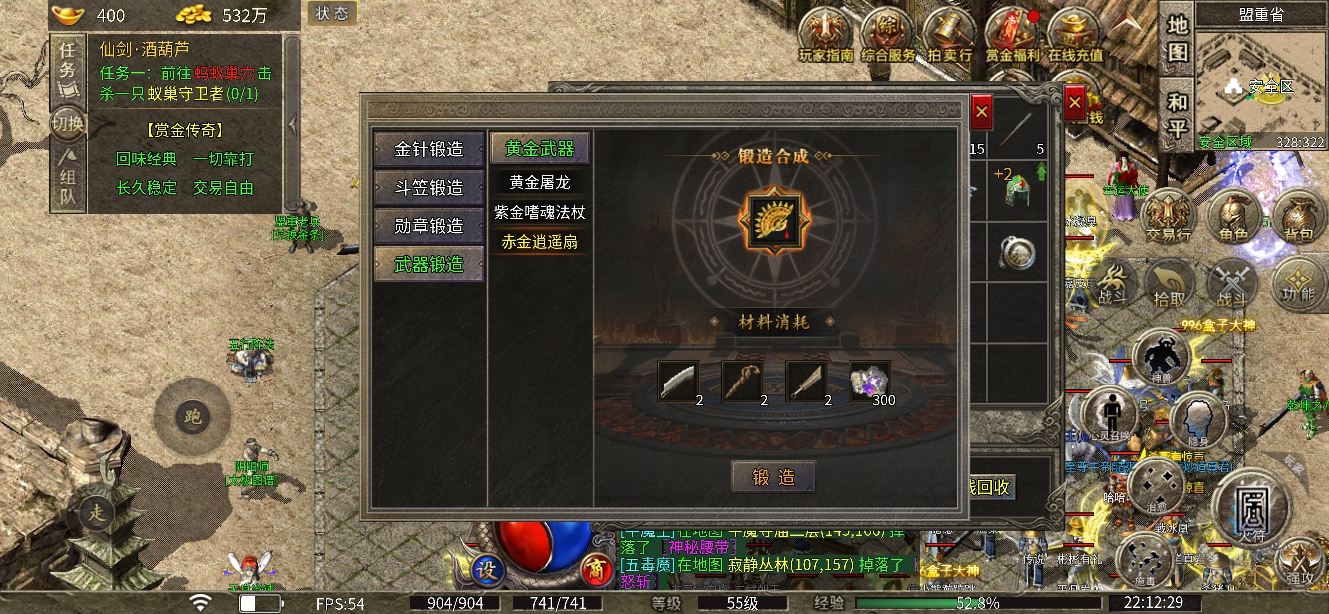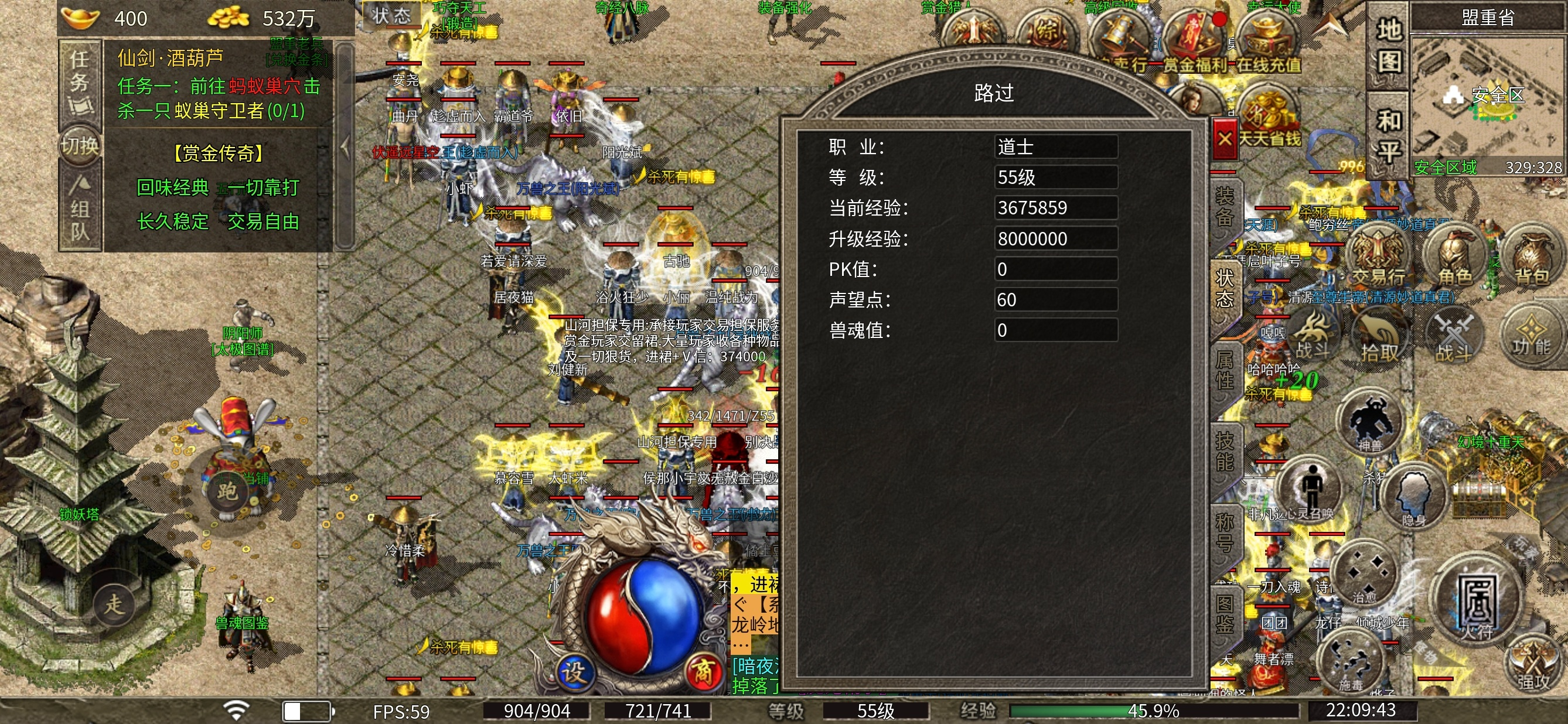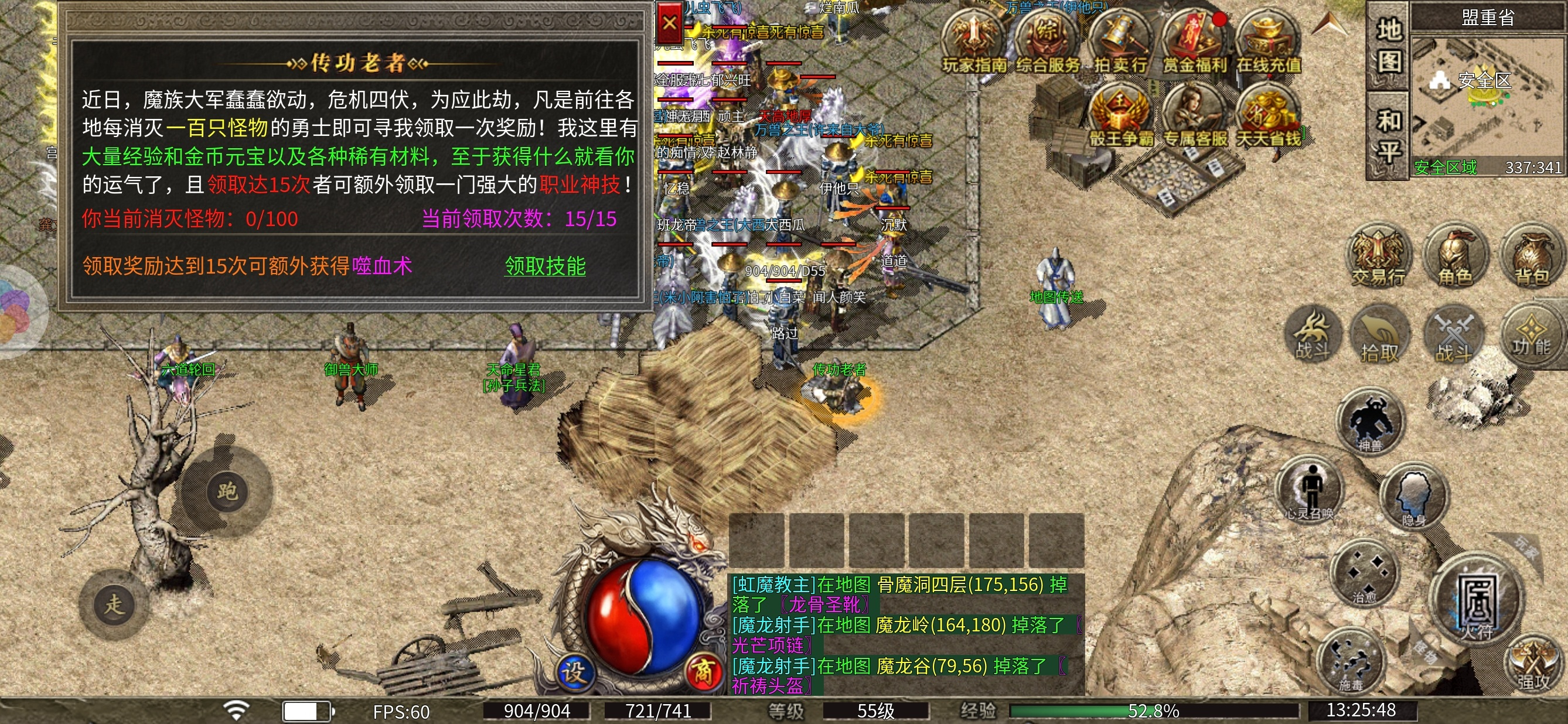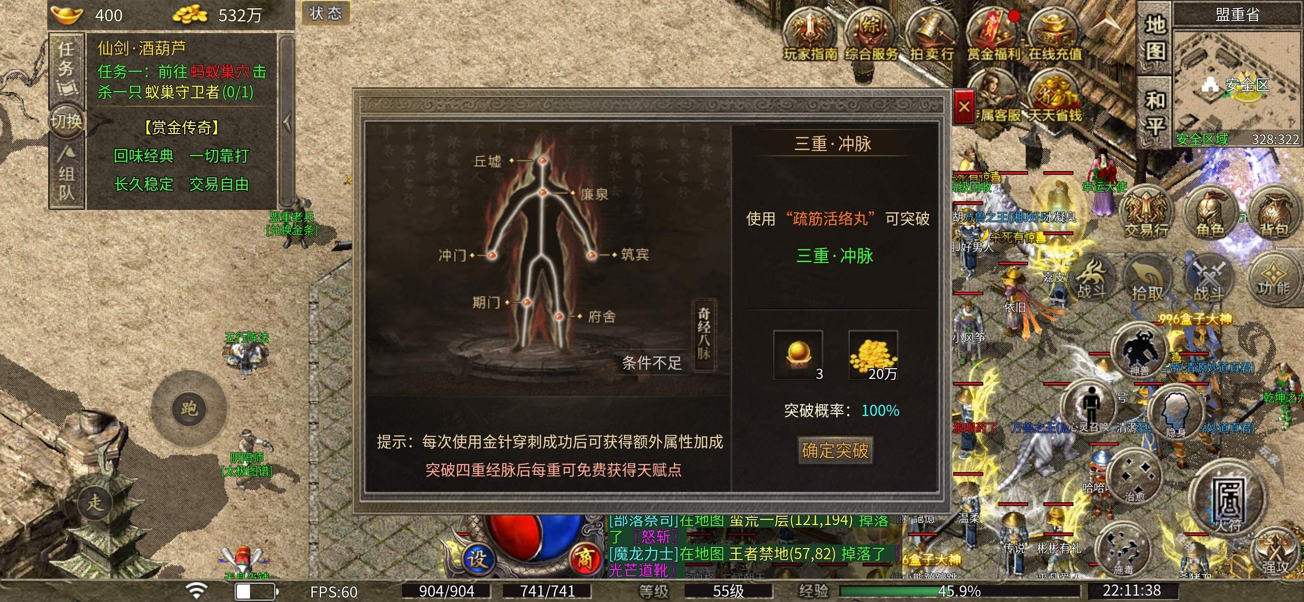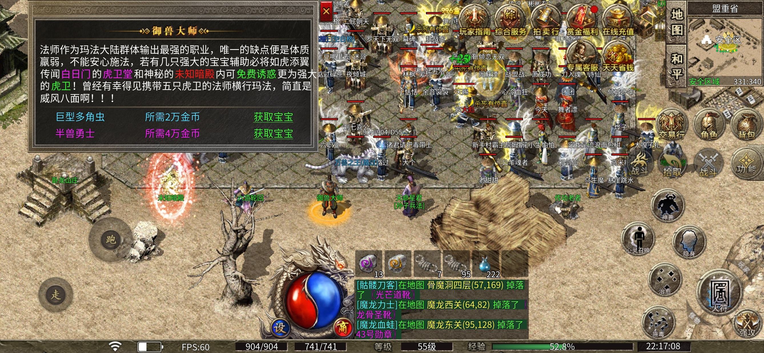 3个人玩的是道士 所以建议前期等级优先升到50级,五十级的道士可以召唤白虎,有了白虎打怪的效率最起码翻一倍。首充号到这基本上也就体验的差不多了。
