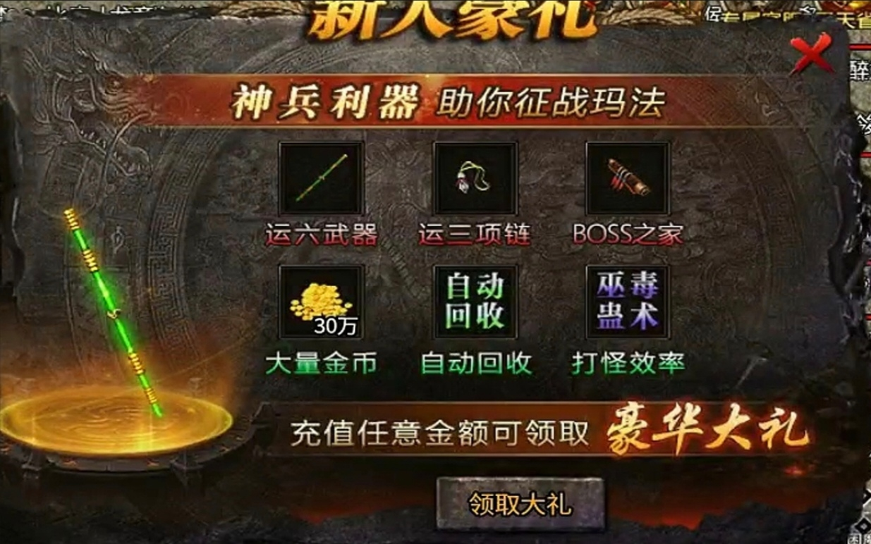 首充必备,如开通月卡可直接领取不需要额外花钱,有自动回收,限时运九装备,合区前战士、法师绿毒,道士对怪增伤。